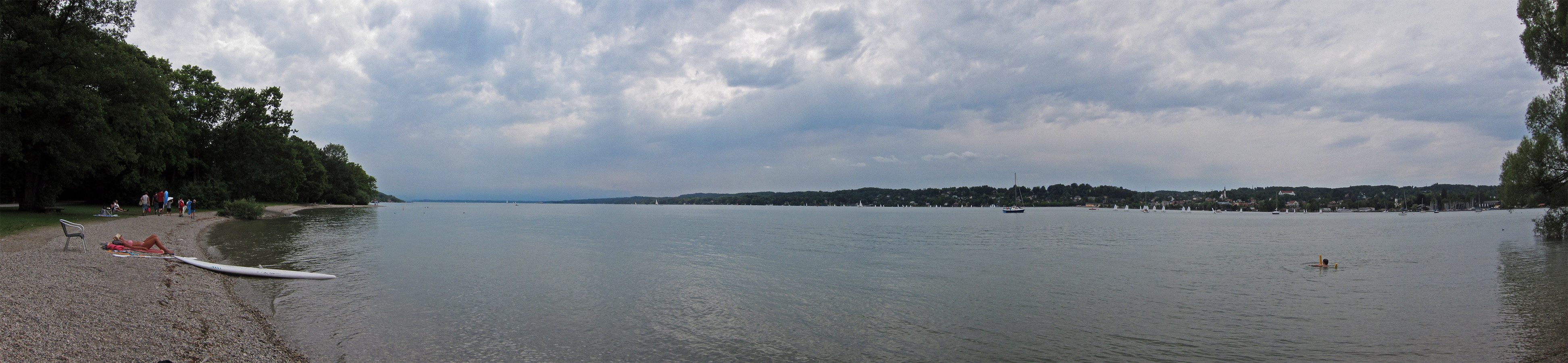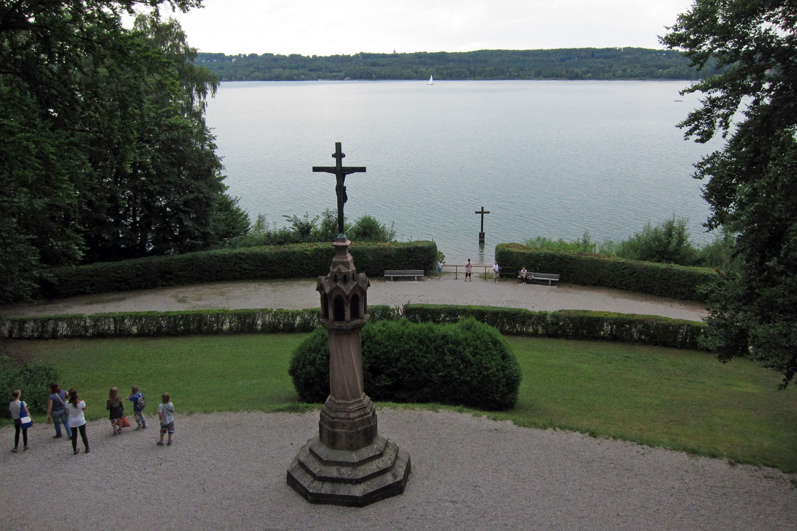 Nach rund einer Stunde war dann der See erreicht. Leider war das Wetter nicht wirklich prickelnd (zum Radfahren perfekt, zum Baden weniger) und so habe ich auf einen Sprung ins Wasser verzichtet (Badesachen hatte ich prophylaktisch mal eingepackt), sondern bin nach einer kurzen Pause ein Stück am See entlang gefahren. Was aber nur teilweise funktioniert (der Weg führt immer mal wieder größere Stücke vom Ufer weg), denn etliche Uferstücke werden von Villen belegt. „Privatgrundstück“. Ich habe mir sagen lassen, dass diverse vermögende Münchner dort ein Wochenendhäuschen stehen haben. Dem scheint auch so zu sein. Etliche der Häuser kann man wenigstens als „feudal“ bezeichnen und sehr viele bekommt man erst gar nicht zu sehen, da sie hinter meterhohen Hecken und sonstigem Sichtschutz verborgen sind. Ich will auch reich sein! Und dann bin ich doch tatsächlich (völlig unabsichtlich) auf die Gedenkstätte für König Ludwig gestoßen. Gut, ich hätte mich ja vorher mal informieren können, was es am Starnberger See so alles zu sehen gibt und eigentlich wusste ich ja auch, dass der werte Herr seinem Leben bei Starnberg ein Ende gesetzt hat. Diese harmlose Äußerung hetzt mir jetzt vermutlich viele Bayern auf den Hals, die davon überzeugt sind, dass Ludwig seinem Leben keineswegs selbst ein Ende gesetzt hat, sondern dass das alles ein großes Komplott war. Davon sind hier nämlich recht viele Menschen überzeugt. Wie dem auch sei, man hat ihm eine Gendenkkapelle in den Wald gebaut, samt Kreuz im Wasser. Durchaus nett anzuschauen. Wobei ich über das Kreuz im Wasser dann doch etwas schmunzeln musste. Ist das die Stelle, an der sie ihn herausgefischt haben? Ebenso grinsen musste ich über die Tatsache, dass es bei Strafandrohung verboten ist, an der Stelle zu baden. Ja, man nimmt sie heute noch ernst, die Sache mit den Kaisern und Königen. Und dem Ludwig sowieso und insbesondere.Nach einer kurzen Regenzwangspause ging es dann zurück Richtung Starnberg. Einen Ort, den man in meinen Augen nicht unbedingt gesehen haben muss. Es sei denn, man ist Tourismus-Fan. Denn letztlich muss man die Stadt wohl etwas abfällig als „Touristenkaff“ bezeichnen. Hotelbunker (es geht schlimmer, aber hübsch sind sie auch nicht gerade), „Seepromenade“ mit den üblichen Imbisspostkartenandenkenkruscht-Buden. Bootsverleih, Schiffsanleger. Alles recht hübsch herausgeputzt. Aber eben beliebig austauschbar. Und etwas überlaufen. Dementsprechend habe ich mir auch nur einen Kaffee gegönnt und bin wieder zurückgeradelt. Nicht ohne den Plan zu fassen, irgendwann mal um den ganzen See herumzufahren. Müsste sich nämlich an einem Tag auch ganz gut machen lassen, allerdings werden es dann rund 50 Kilometer mehr Strecke. In Summe dann also rund hundert. Da sollte ich noch ein paar Meter trainieren, bevor ich das angehe…