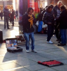 Ich empfinde städtische Fußgängerzonen in der Vorweihnachtszeit bekannter Maßen als Vorhof zur Hölle. Nicht nur, dass das Gros der Menschen ihre Weihnachtsgeschenke offensichtlich noch immer nicht online kauft, sondern einen masochistischen Spaß daran zu haben scheint, sich an Samstagen durch die Innenstädte zu schieben. Nein, auch die Anzahl offensichtlich talentbefreiter Straßenmusiker nimmt empfunden mit jedem Tag zu. Lassen wir die mit Eröffnung der Weihnachtsmärkte aus allen Winkeln hervorkriechenden geigenden und blockflötenden Kinder mal außen vor (deren Auftritte empfinde ich eher als mutig denn peinlich), bleiben genug Beispiele über, deren Präsenz zumindest bei mir das Gegenteil dessen bewirkt, was man sich von Straßenmusikern eigentlich erhofft: in mir melden sich schlagartig Fluchtreflexe.