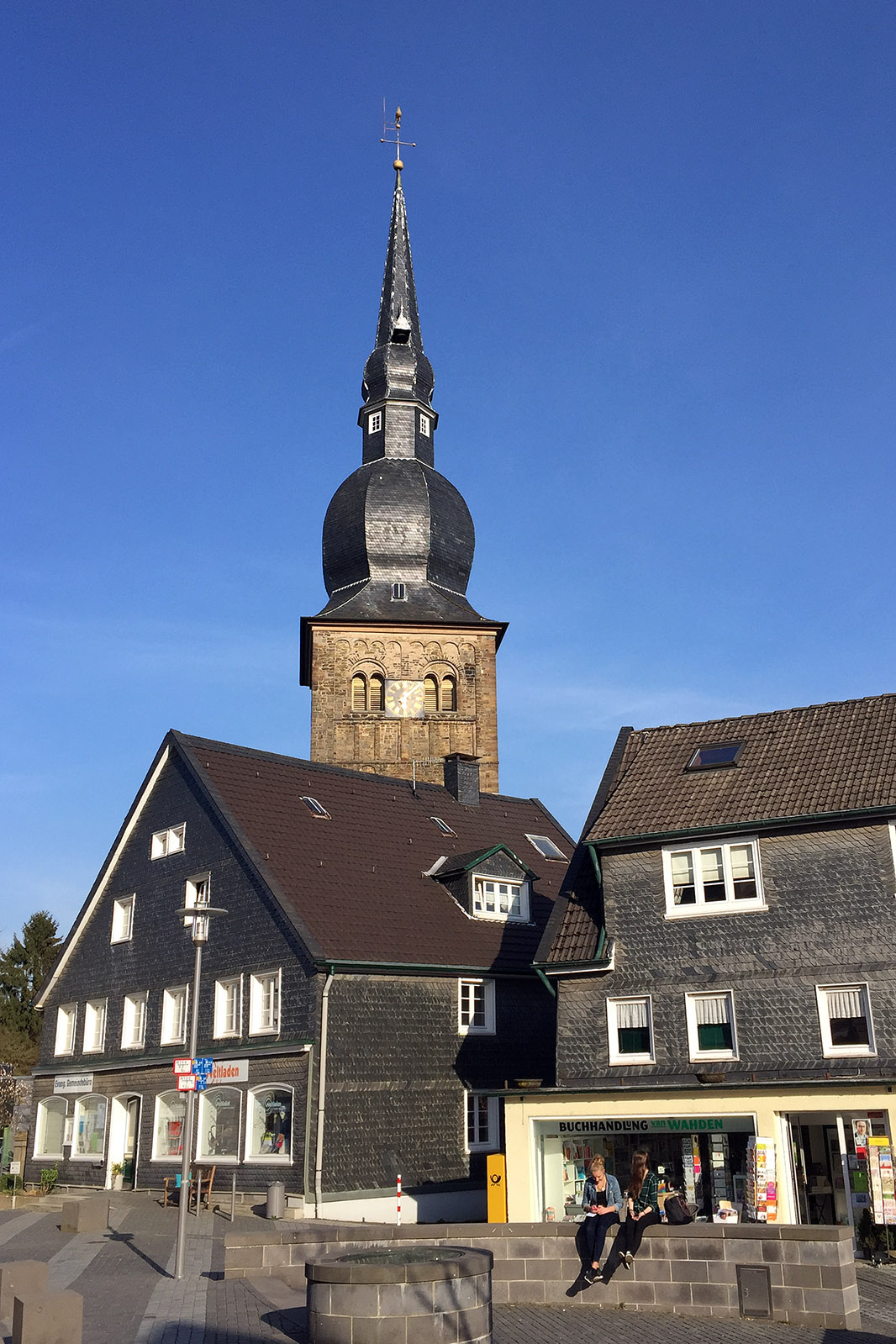 Wie sie so dalagen, die Häuschen und die Kirche: In der Frühlingssonne sahen die richtiggehend romantisch oder gar pittoresk aus. Plötzlich gar nicht mehr fad und depressionsfördernd, nein, glatt schon Tourismusprospektgeeignet. Allerdings fürchte ich, dass das ein reichlich übersichtlicher Prospekt würde, denn rein touristisch betrachtet gibt Wermelskirchen nun wahrlich nicht viel her. Aber ich war ja auch zum Arbeiten dort und nicht zum Urlauben. Einen Abend vor Ort kann man dann schon ganz gut verbringen. Und sei es nur, um sich in aller Ruhe den alten Stadtkern anzusehen, ein Eis zu genießen und dann den Rest des Abends im Hotelzimmer zu verbringen.