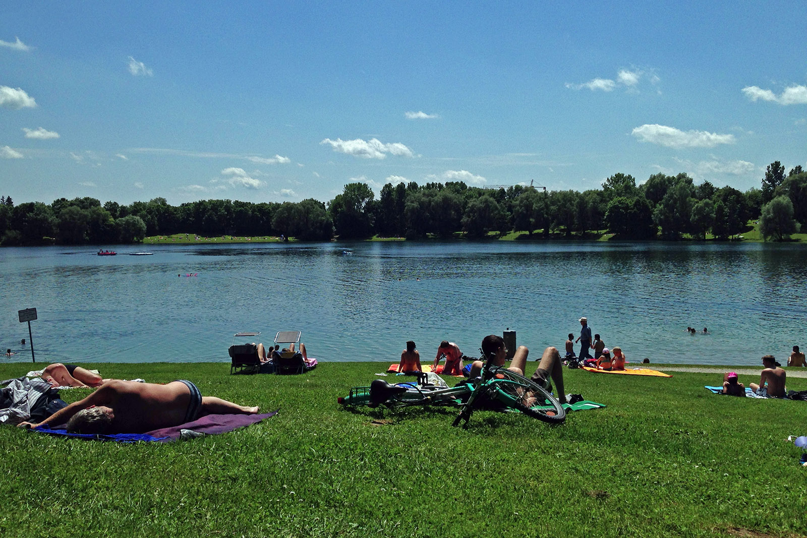 Aber wie gehabt: Vor zwei Wochen sah das ganz anders aus und der Radtour am Samstag folgte ein Ausflug zum Heimstettener See (laut Wikipedia eine bis Ende der dreißiger Jahre des vergangenen Jahrhunderts genutzte Kiesgrube). Ebenfalls per Rad, natürlich, wobei die Fahrstrecke gemessen an der vom Tag davor geradezu lächerlich erscheint. Von Neuperlach über Trudering und Riem führte der Weg rund 10 Kilometer nordöstlich Richtung Heimstetten. Die einzige Herausforderung der Strecke bestand darin, im künstlich angelegten Park in Riem (wo man es auch durchaus aushalten kann, auch wenn es dank der recht jungen Bäume noch relativ wenig Schatten gibt) den ganzen Fußgängern auszuweichen, die offensichtlich beschlossen hatten, den Radfahrern einen gewissen Nervenkitzel zu bieten. Denn wozu am Wegesrand laufen, wenn man auch zu mehreren nebeneinander mittig die Wege entlangschlendern oder dem herannahenden Radler durch einen spontanen Richtungswechsel einen unerwarteten Überraschungseffekt bescheren kann? Ich verbuche das einfach mal als Fahrsicherheitstraining am lebenden Objekt.