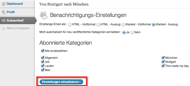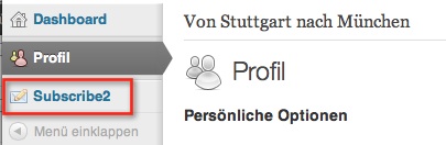 - In deinem Profil findest du links den Menüpunkt „Subscribe2“. Sei mutig und klicke drauf: