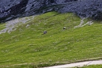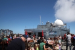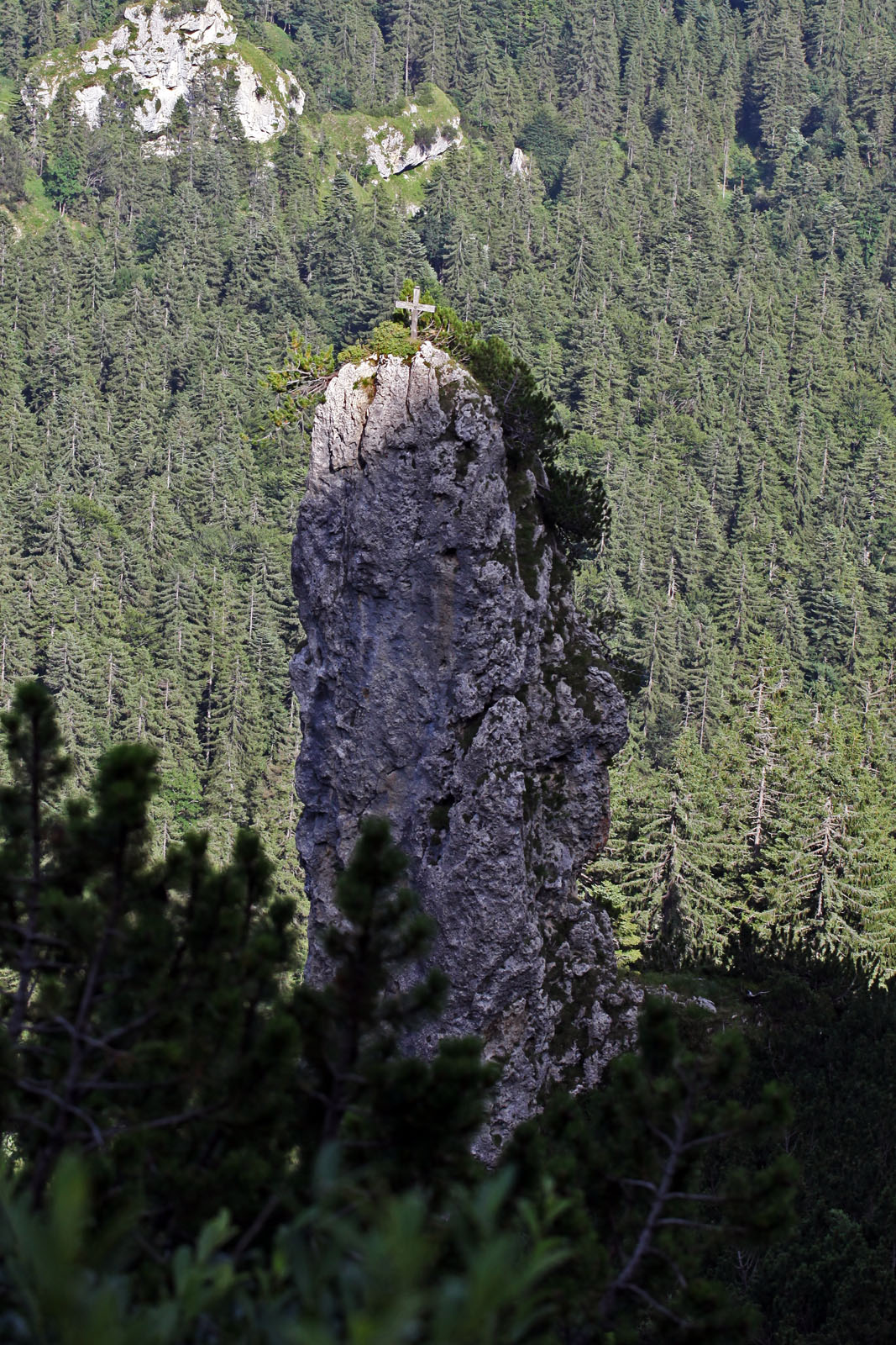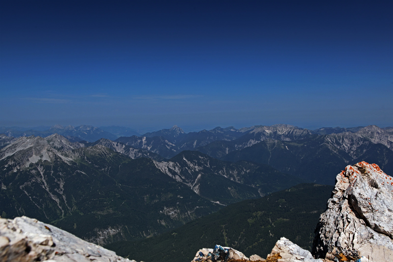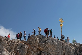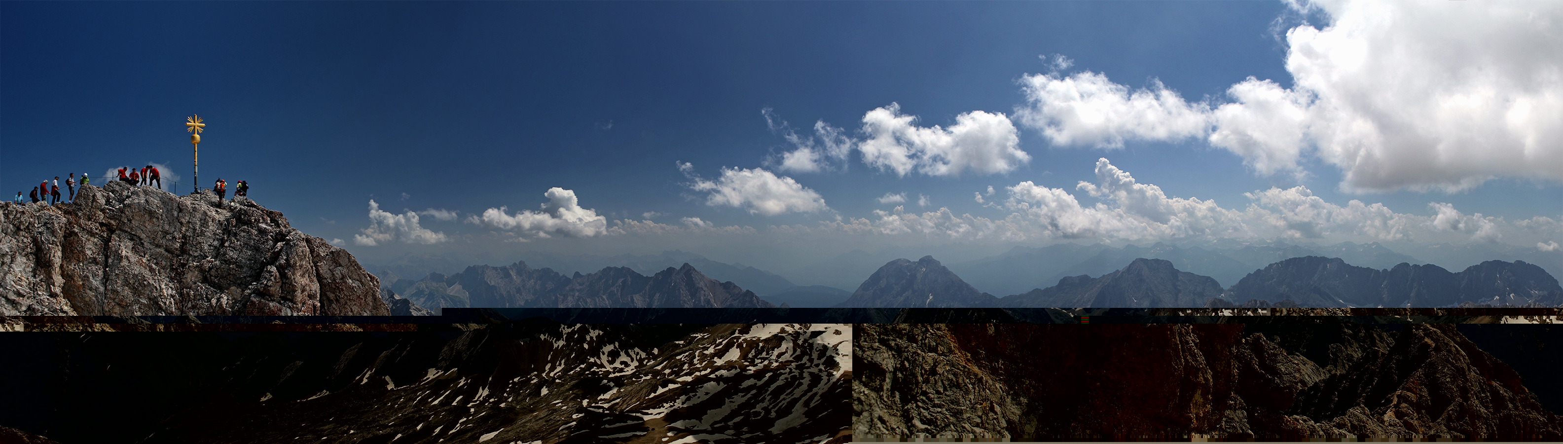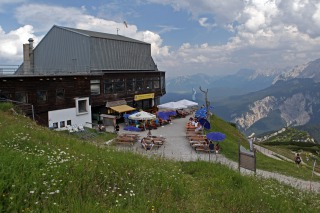 Wieder zurück nahm ich dann die Seilbahn hoch zum Gipfel. Eine Aktion, die ich mir hätte sparen sollen. Ehrlich. Sieht man vom Ausblick ab, ist da oben ziemlich wenig wirklich „schön“. Mich hat (inzwischen war es schon 13:00) schier der Schlag getroffen, als ich oben angekommen bin. Es hatte den Anschein, als würde es irgend etwas umsonst geben – warum sonst sollte es dort so voll sein? Sommerschlussverkauf? Heino singt seine schönsten Berglieder? Wer meine „Vorliebe“ für große Menschenmengen kennt, dürfte wissen, wie ich mich gefühlt habe. Für alle anderen: Nach rund fünf Minuten Aufenthalt kamen schwer zu unterdrückende Gelüste auf, den nächstbesten dumm im Weg stehenden Touristen (nein, ich selbst bin kein solcher, keinesfalls!) über die nächste Brüstung schupsen. Um zum Gipfelkreuz zu gelangen muss man ein paar Meter klettern (was ich nicht getan habe, ich wollte mir nicht auf die Füße treten lassen) – dass man dort keine Nummer ziehen musste, war schon fast ein Wunder. Nötig wäre es durchaus gewesen, es war proppenvoll. Und man glaubt ja gar nicht, wie manche dort unterwegs sind. Ich habe ernsthaft Menschen gesehen, die sich in Sandalen auf den Klettersteig zum Gipfelkreuz begeben haben. In solchen Momenten finde ich es spontan immer schade, wenn sie nicht runterplumpsen. Verdient hätten sie es.Ansonsten hat die Gipfelstation wirklich nichts zu bieten außer überteuerten Snacks, kitschigen Postkarten und allerlei idiotischem Nippes. Nein, den Besuch da oben kann man sich wirklich schenken. Oder wenigstens nicht mehr als zehn Minuten Aufenthaltsdauer einplanen. Die reichen nämlich um einmal in alle Richtungen zu schauen. Übrigens: Den Einzigen, denen ich den Besuch auf dem Gipfelkreuz gegönnt habe, war eine Gruppe von drei Kletterern, die wirklich dahin geklettert sind (sie ist auf einem der Bilder zu sehen). Die nächste Stufe der sinnfreien Tourismusförderung wäre vermutlich die Installation einer Rolltreppe zum Gipfelkreuz. Würde mich nicht wundern, wenn man darüber schon nachdenkt.