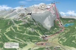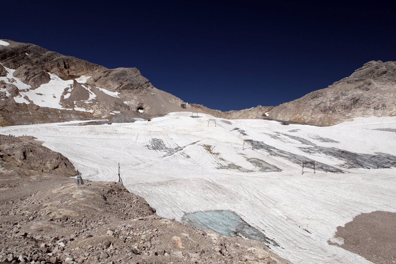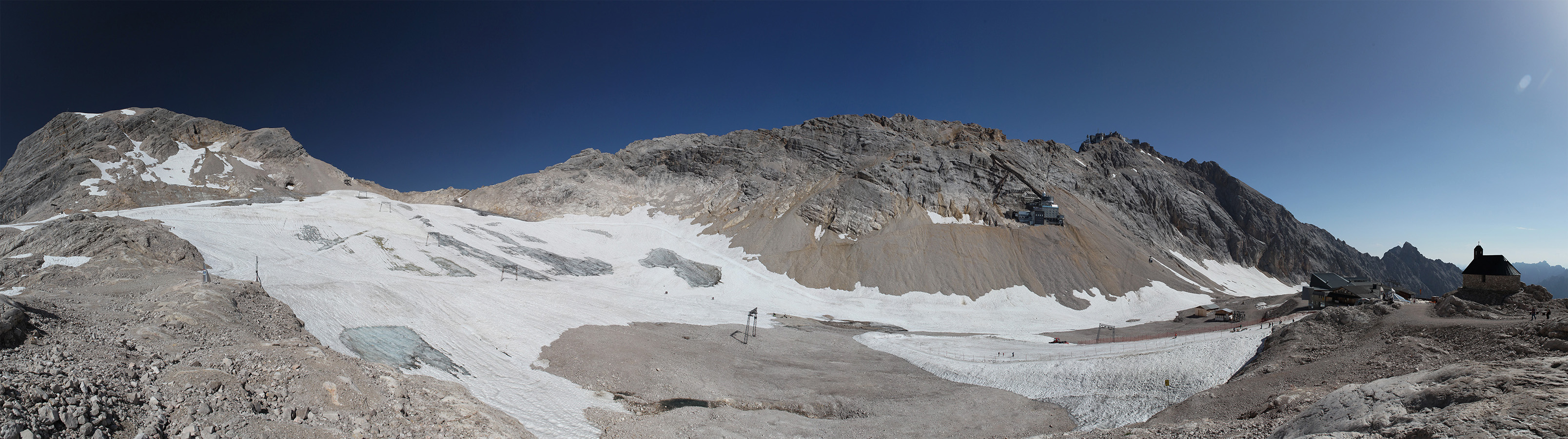 Die Bayrischen Bergbahnen bieten ein Paket aus „Zugspitze“ und „Garmisch Classics“ an, was für nicht eben billige 59 Euro die Fahrt auf die Zugspitze und weitere Fahrten in Richtung Alpspitz ermöglicht. Die zusätzlichen neun Euro für die „Classic“-Variante schienen mir einen lohnende Investition – nur Zugspitze und zurück will mit 50 Euro erkauft werden. Sofern man nicht laufen will. Schön sehen kann man meine Tour auf nebenstehendem Übersichtsplan. Meine Idee: Mit der Zahnradbahn zunächst zum Gletscher unterhalb des Zugspitzgipfels, dann mit der Seilbahn hoch, von dort mit der Seilbahn zurück zum Eibsee, wieder in die Bahn bis Kreuzeck, dort mit der Seilbahn hoch zum Osterfelderkopf, weiter zum Kreuzeck und von dort mit der Seilbahn wieder runter. Ab in den Zug und zurück nach Garmisch. Klingt gut. War es auch.Um kurz vor neun saß ich in der Bahn zum Gletscher, was eigentlich zwei Bahnen sind. Man muss nämlich in Grainau von der normalen Bahn in die Zahnradbahn umsteigen. Und mit der ging es dann sehr gemütlich hoch zum Zugspitzgletscher, Foto-Halt oberhalb des Eibsees eingeschlossen. Oben angekommen war plötzlich alles ganz wunderbar. Das Wetter (keine Wolke weit und breit, was sich im Lauf des Tages leider änderte), der Touristenfüllstand (sehr überschaubar), die Temperatur (18 Grad – ein Traum, wozu habe ich eigentlich eine Jacke eingepackt?). Ich hätte mir vom Gletscher etwas mehr erwartet – viel ist von dem aktuell nicht übrig. Laut Führung (der ich mehr oder weniger zufällig kurzfristig beiwohnte) geht er jedes Jahr weiter zurück, was dazu führt, dass man einzelne Skilifte abbaut und an einer anderen Stelle wieder aufstellt. Am Rand des Gletschers habe ich zunächst einen recht ausgedehnten Spaziergang zum Bergkamm unternommen, da man von dort einen tollen Ausblick haben sollte. Den hat man auch. Allerdings nötigt mir eine fast senkrecht abfallende Bergflanke dann doch gehörigen Respekt ab – einfach mal schnell so an den Grat stellen ist nicht drin. Eher vorsichtiges hinrobben und krampfhaftes Festhalten der Kamera. Ich war schon entspannter – aber der Blick war es wirklich wert. Das Ganze stellte sich als anstrengender heraus als ich es mir vorgestellt hatte – in den Bergen geht einem der Sinn für Steigungen ein Wenig verloren – der Weg sah eigentlich recht flach aus – er war es allerdings ganz und gar nicht.
