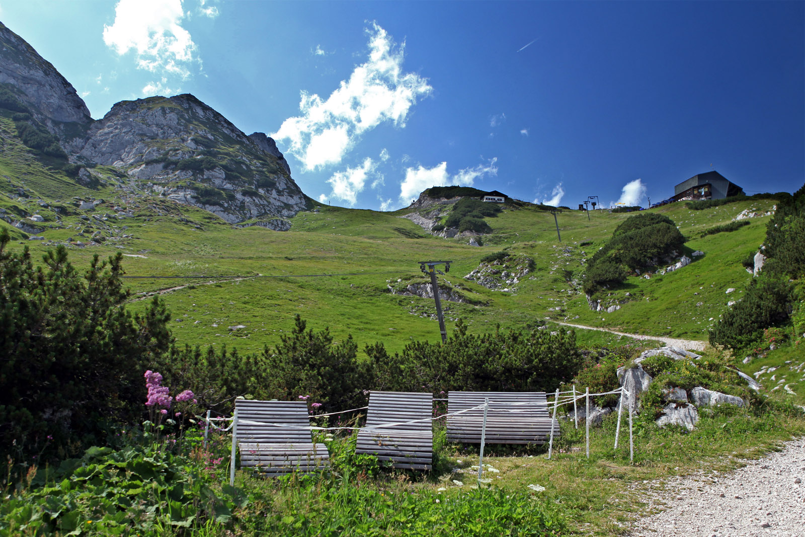 Ihr seht schon: Der Gipfelbesuch gehört nicht zu meinen Tagesheiglights. Aber ich wurde entschädigt. Denn als ich dann mit der Seilbahn auf den Osterfelderkopf gefahren bin, war alles wieder gut. Hier war alles sieben bis neun Nummern entspannter. Nur wenige Touristen, Ruhe, romantische Bergwelt at it’s best. Hierher hätte ich gleich kommen sollen, denn jetzt hatte ich das, was ich mir insgesamt erhofft hatte. Dieses oft beschriebene Gefühl von Freiheit und Entspannung. Auf die Wiese setzen und die Natur genießen. Hier ging das plötzlich. Die eineinhalb Stunden Spaziergang (man kann das erheblich schneller schaffen, aber ich habe zwischendurch zu viele Bilder gemacht, was dann doch immer etwas aufhält, aber genau dazu bin ich ja hergekommen) zum Kreuzeck waren sehr fein. Der örtliche Tourismusverband hat sich hier viel Mühe gegeben – entlang des Weges gibt es diverse Stationen (die eigentlich für Kinder gedacht sind) an denen man etwas über die Bergwelt lernen kann, die lokalen Sagen kennenlernt, Bergkräuter-Duft schnuppern darf oder sich ein paar hölzernen Liegestühlen entspannen kann. Das hat richtig Spaß gemacht!„Wieder was gelernt“ würde ich sagen. Zugspitze auslassen, weniger prominente Berge besuchen. Und die dafür umso mehr auskosten. Ob ich mich je an einen Klettersteig wagen werde, kann ich nicht sagen. Vermutlich eher nicht, aber man kann ja auch ohne jede Menge Spaß haben. Ich gehe davon aus, dass ich die 80km in Richtung Berge in Zukunft häufiger auf mich nehmen werde…