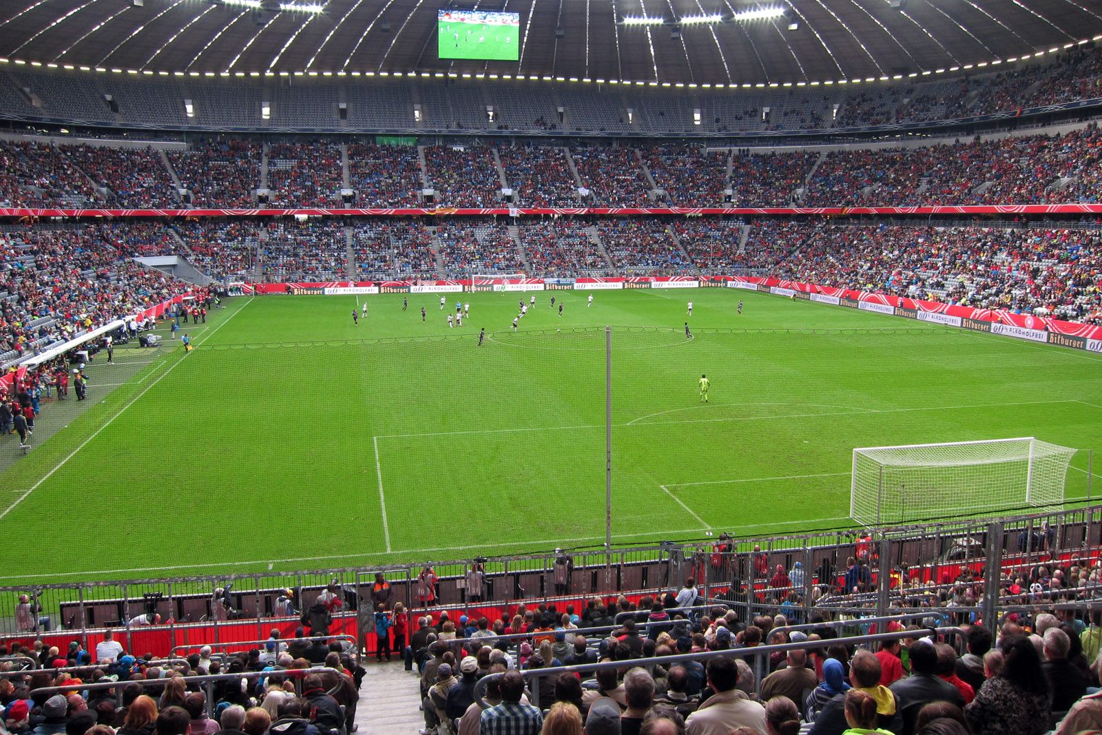 Langsam kann ich die Tage rückwärts zählen, bis ich meinen ersten Jahrestag in München feiern kann. Und auch wenn ich mir Mühe gegeben habe, möglichst viel in und um München zu entdecken – zur Allianz Arena habe ich es bis heute nicht geschafft (wenn man davon absieht, dass ich einigermaßen regelmäßig auf der Autobahn an ihr vorbei fahre). Aber hinter dieses Todo kann ich nun auch ein Häkchen machen. Kollege René, der nebenher für die Frauen-Abteilung des FC Bayerns arbeitet, hat uns Karten für das Frauen Länderspiel Deutschland gegen Japan am vergangenen Samstag besorgt. Für lau (die regulären Eintrittspreise betrugen zwischen sieben und elf Euro, wären also auch durchaus bezahlbar gewesen), da kann der Schwabe in meinem Herzen natürlich nicht „nein“ sagen, auch wenn ich Frauenfußball jetzt nicht unbedingt zu meinen Lieblingssportarten zähle. Die Anreise gestaltete sich etwas abenteuerlich, da erstens zeitgleich im Olympiapark die X-Games stattfanden (=Chaos in den zentralen U-Bahnhöfen) und weil die Linie, die normalerweise zum Stadion führt, derzeit wegen Bauarbeiten ein paar Stationen früher endet und der rest per Ersatzbus bedient werden muss. Die waren zwar maßlos überfüllt, aber man muss dem MVV zugutehalten, dass sie sowohl die Anreise als auch den Abtransport der Stadionbesucher gut organisiert hatte. Die hatten wirklich viele Busse aufgeboten um (meine persönliche Schätzung) mindestens 20000 Leute nach Fröttmaning zu karren. Wir sind auf alle Fälle nicht (was ich befürchtet hatte) in der Prärie gestrandet. Weder bei der Hin- noch bei der Rückreise. Über 46000 Menschen wollten das Fußballspiel sehen, was, laut Stadionsprecherin, ein Rekord für ein Frauenfußballspiel in Europa darstellt. Soll mir Recht sein, der Stimmung kam das in jedem Fall sehr entgegen, wobei die Jubel-Töne dank der extrem vielen anwesenden Kinder und Jugendlichen höher ausfielen, als man das normalerweise gewohnt ist. Wobei wir definitiv mehr Spaß an den Kommentaren der mal mehr mal weniger fachmännischen Sitznachbarn hatten als mit dem Spiel selbst. Das war einfach Fußball, würde ich sagen. Definitiv besser als ich ihn zu spielen vermag, aber auch nicht so beeindruckend, dass ich später mal meinen Enkeln davon erzählen würde. Und, ich geb’s ja zu, außer Silvia Neid kannte ich niemanden namentlich, der dort auf oder um den Platz herum stand. Aber das Spiel an sich war für mich sowieso Nebensache, ich wollte ja primär einfach mal in der Arena gewesen sein. Ich muss gestehen, dass ich mir das Stadion innen weiträumiger vorgestellt hätte – im Fernsehen wirkt die Arena größer als sie ist. Durch die recht steile Bauweise der Ränge (was dazu führt, dass man eigentlich von überall gut sieht) und den Bau derselben bis fast an den Spielfeldrand ist alles relativ kompakt. Und laut. Ich vermag mir nach gestern grob vorzustellen, was in dem Stadion los ist, wenn der FCB beispielsweise gegen Dortmund spielt. Denn auch wenn die Stimmung gut war, kann man das stimmungstechnisch mit einem hochklassigen Bundesligaspiel sicher nicht vergleichen. Ich seh‘ schon: Ich muss René mal fragen, ob er auch an Karten für ein Bayern-Spiel rankommen kann. Muss ja nicht gleich der Klassiker gegen den VfB sein.