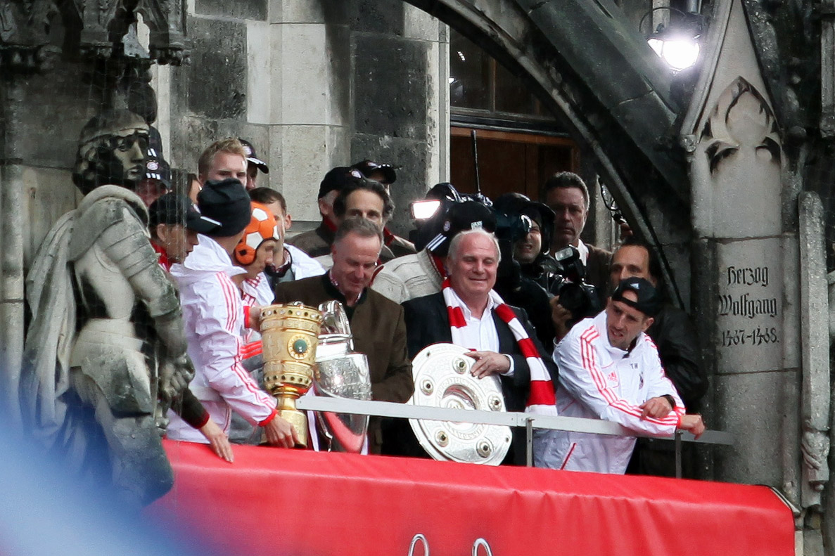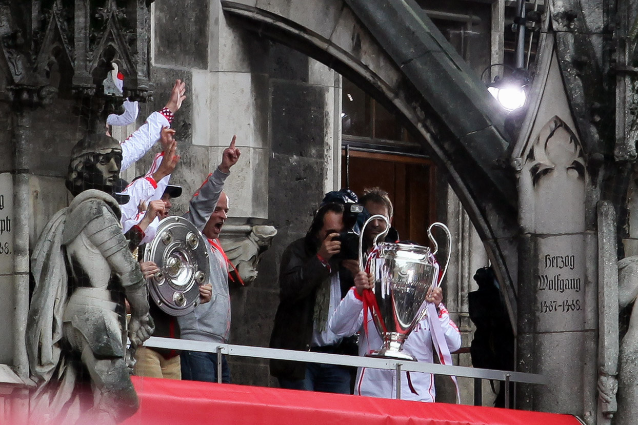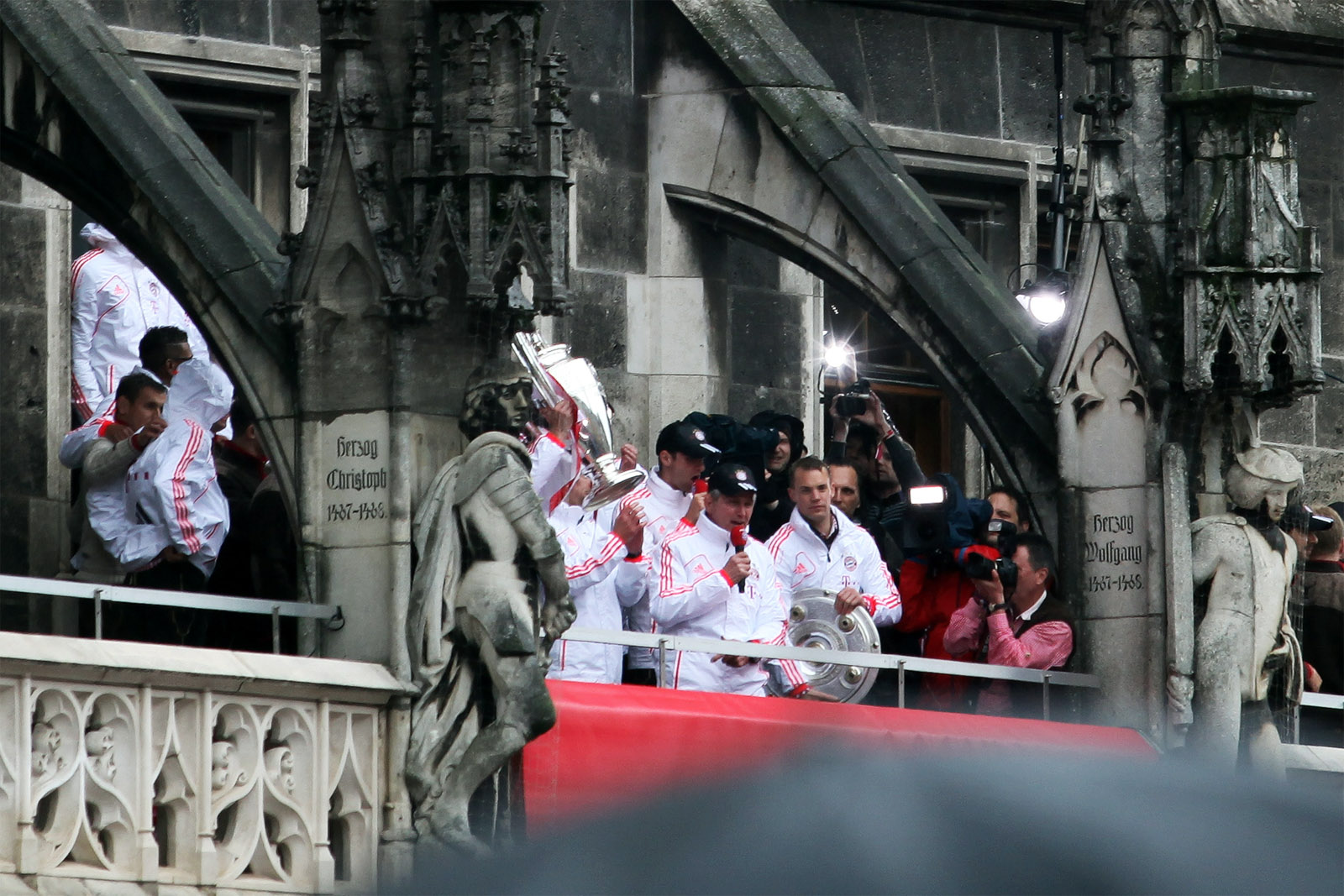 Vergangenen Samstag haben sich „die Bayern“ ja bekannter Maßen den dritten Titel in der laufenden Fußballsaison geholt. Das Pokalendspiel – in Stuttgart mit Freunden in einer urschwäbischen Kneipe genossen – versetzte mich in eine gewisse Luxussituation. Meine alte Heimat gegen die neue – da konnte ich nur gewinnen. Egal wer das Spiel gewinnen würde, ich könnte mich drüber freuen. Wobei ich keinen Hehl daraus mache, dass ich den Bayern einen Sieg mehr gönne als dem VfB – denn erstens haben Erstere nunmal die erheblich überzeugende Saison hinter sich als die Schwabenkicker und zweitens spekulierte ich einfach auf eine bessere Feier. Wenn ich doch schon in München lebe, dann würde ich schon gern erleben, wie man dort den Gewinn des historischen Triples feiern würde. Und schlussendlich hätte ein Pokalsieg der Stuttgarter sowieso nur dazu herhalten müssen, eine (zu Recht) weitgehend in der Bedeutungslosigkeit verbrachte Saison und die Missverhältnisse im Verein schönzureden. Nee, lasst mal Jungs. Der FCB hat in München einen Stellenwert, den man nicht mit dem des VfB in Stuttgart vergleichen kann – Bayern ist in München omnipräsent. Überall. Immer. An jeder zweiten Straßenecke, in den Medien sowieso, selbst auf Joghurtdeckeln. Die partielle Großspurigkeit, mit der sich der Bayer an sich über den Rest der Republik erhebt, lässt sich auch auf seine Sicht über „die Roten“ anwenden. Die Quintessenz diverser aufgeschnappter Gespräche lautet inetwa: Natürlich ist das der beste Verein der Welt. Völlig selbstverständlich habe man alle Titel gewonnen, so und nicht anders müsse das auch sein. Die Weltordnung ist hergestellt, wir sind mal wieder die Größten. Da mögen die paar verbliebenen doofen 1860-Fans anderer Meinung sein, aber wer sind die denn schon? Und auch den merkwürdigen Typen aus Dortmund hat man jetzt endlich mal wieder bewiesen wo der Barthel den Most holt. Jawoll! Natürlich hätte man sich in Stuttgart sicher sehr gefreut, hätte man quasi „aus Versehen“ und eher zufällig den Pokal gewonnen, aber es wäre (so vermute ich) nicht mit München vergleichbar gewesen. Denn das, was am Sonntag passierte, als die Mannschaft die Titel öffentlich präsentierte, war in der Tat ein beeindruckendes Lehrstück über Ausgelassenheit und Heldenverehrung (gut, den Dortmundern hätte ich eine ähnlich ausufernde Feierei zugetraut, aber die haben nunmal das Champions League Finale verloren, so sieht’s aus, sorry). Aber es geht an dieser Stelle ja eigentlich gar nicht darum, welche Fußballmannschaft denn nun die Beste ist… Die Randbedingungen waren leider mehr als nur eklig – es schüttete. Heftig. Ununterbrochen. Es war kalt. Es war windig. Ich hatte kurz überlegt, ob ich mir die Busfahrt der Spieler durch das Fan-Spalier von der Münchner Freiheit zum Marienplatz ansehen soll, mich dann aber dafür entschieden, einfach gleich auf dem Marienplatz zu bleiben. Berücksichtigt man das Wetter, war dennoch mehr als nur reichlich was los. Rot-weiße Schals überall, lediglich die Fahnen wurden zumeist durch Regenschirme ersetzt. Und (hey, wir reden vom Freistaat Bayern, Recht, Ordnung und Sicherheit haben immer vorzugehen, auch wenn es aus Kübeln schüttet und jeder gewaltbereite Fan sich lieber daheim verkriecht als irgendwo Ärger machen zu wollen) natürlich ein Polizeiaufgebot, mit dem man auch locker zwei Sicherheitskonferenzen gleichzeitig hätte beschützen können, über die ich mich seinerzeit so aufgeregt habe. Alles weiträumig abgesperrt, Taschenkontrollen an den Eingängen. Nuja, irgendwie muss das ganze Sicherheitspersonal je beschäftigt werden. Summa summarum waren aber offensichtlich weniger Menschen unterwegs, als man erwartet hatte – zumindest ging es auf dem Marienplatz selber noch einigermaßen übersichtlich zu. Man stand zwar dicht beieinander, aber richtig eng war es sicher nicht. Bei strahlendem Sonnenschein wäre da sicher erheblich mehr los gewesen.