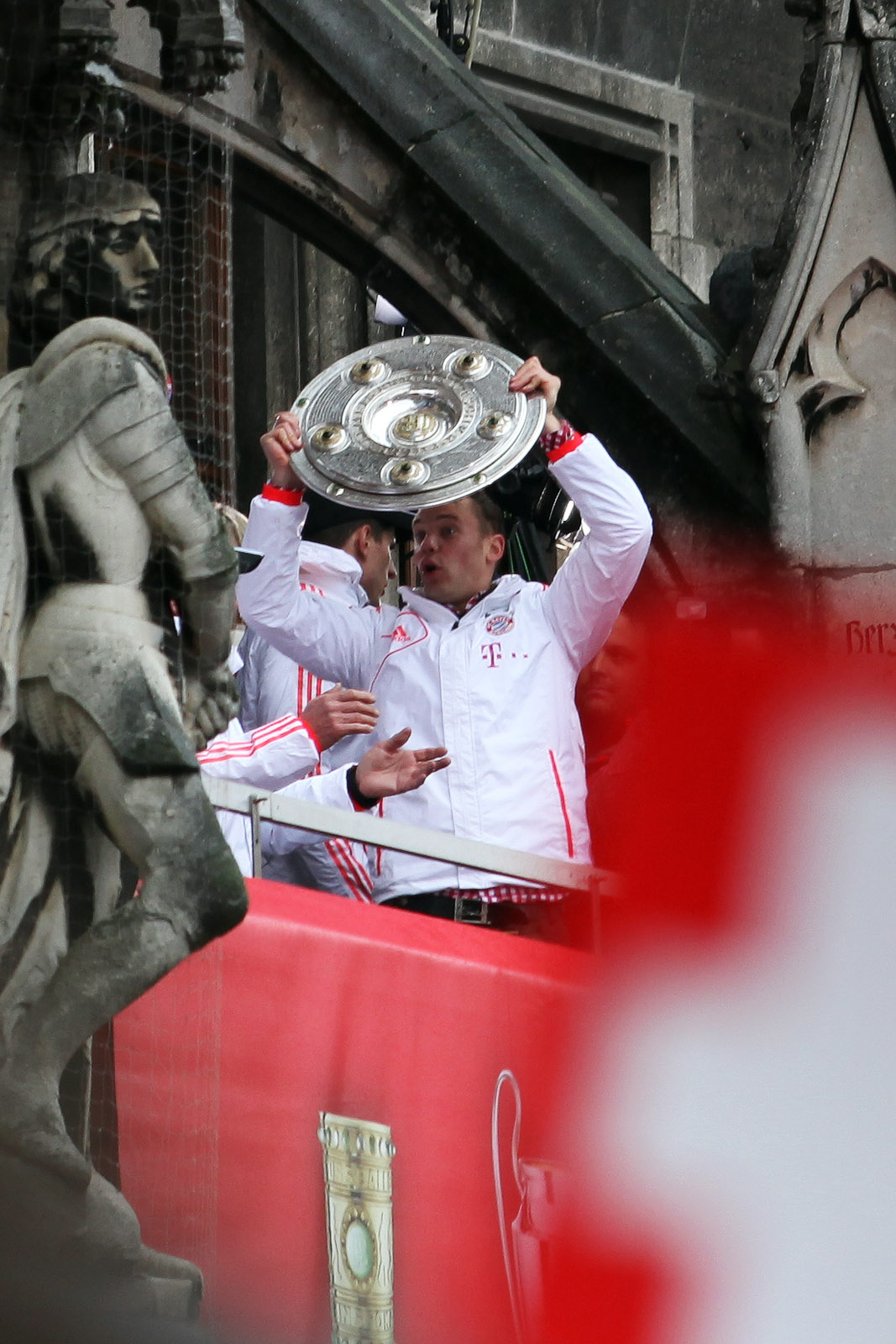 Aber dennoch: Die Stimmung war beeindruckend. Fangesänge, Regenschirmschwenken, Jubel, Trubel, Heiterkeit. Und dann, leicht verspätet, kamen sie endlich. Die Helden. Dem Anschein nach unter nicht zu unterschätzendem Alkoholeinfluss (ich hatte ja schon während des Spiels am Vortag den Eindruck, als hätten einige von denen noch einen deutlich messbaren Alkoholpegel von der Feier des Champions League Gewinns im Blut). Jeder Spieler wurde natürlich einzeln und frenetisch begrüßt. Die Lieblinge waren dennoch recht eindeutig auszumachen – die Herren Ribery, Lahm und Schweinsteiger. Richtig turbulent wurde es aber, als der Messias den Balkon betrat. Der Herr, dem man vermutlich ein Denkmal setzen wird – nicht wenige würden vermutlich befürworten, die Figur auf der Mariensäule gegen einen vergoldetes Abbild seiner zu ersetzen.