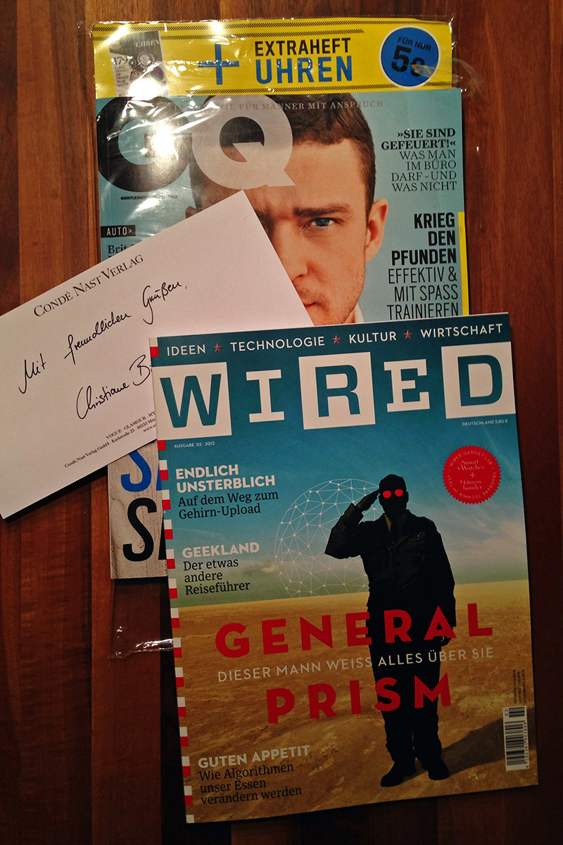 Eine weitere Kommunikation mit ihm war allerdings gar nicht notwendig, denn ein paar Minuten später kam eine weitere Mail, in der ich gebeten wurde, ob ich mein „kaputtes“ Exemplar nicht unfrei an den Verlag zurücksenden könne – und wenn ich kurz meine Adresse durchgäbe, würde ich umgehend ein neues Exemplar bekommen.Tatsächlich: schon am folgenden Tag lag ein dicker Umschlag im Briefkasten – die Wired (dismal in der Tat vollständig) und, als Dreingabe, noch eine neue Ausgabe der nächsten GQ. Und nachdem der Wert eines Wired-Fehldruckes in mittlerer Zukunft vermutlich nicht den einer Blauen Mauritius erreichen wird, habe ich mein Exemplar dann kurz später zurück geschickt.