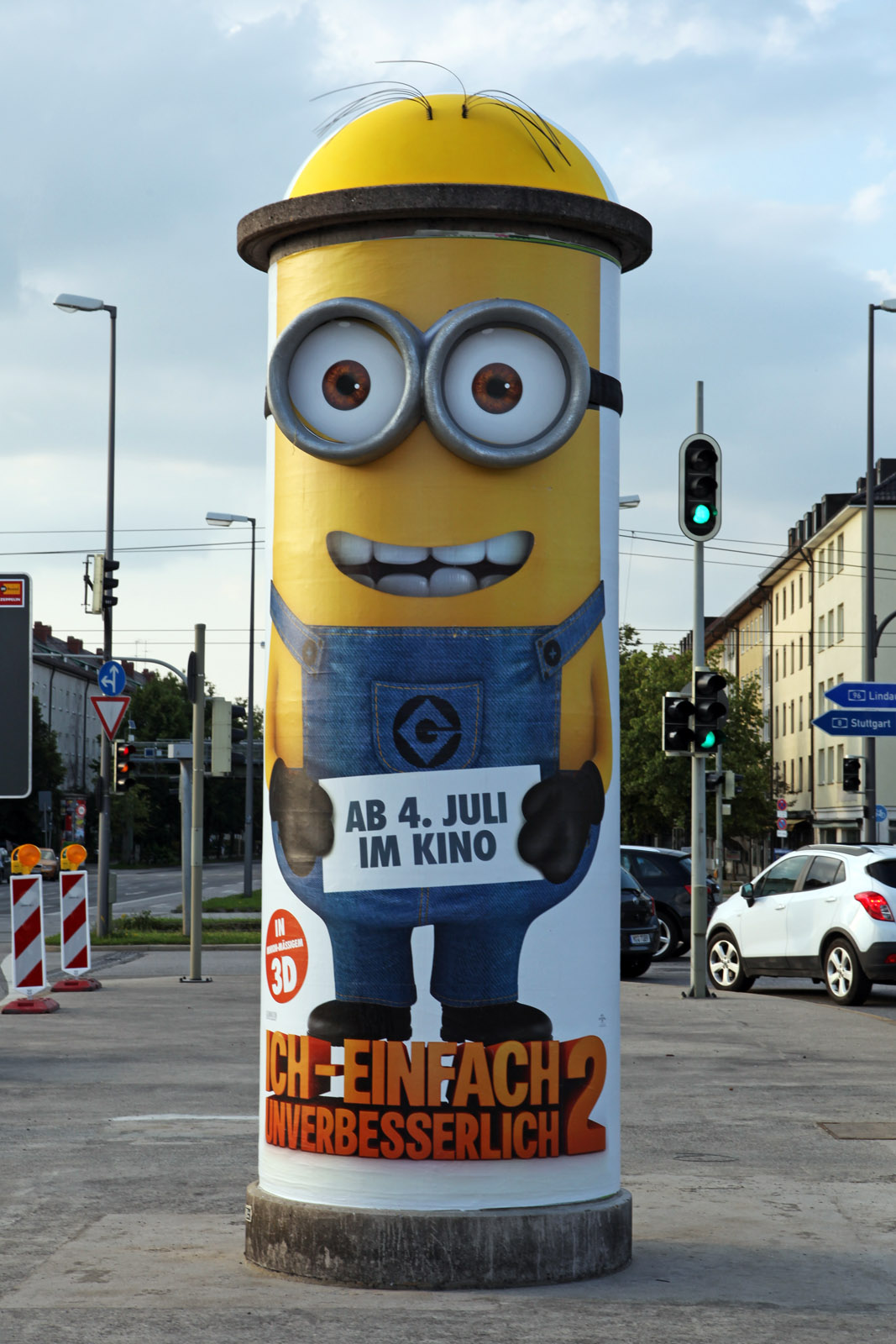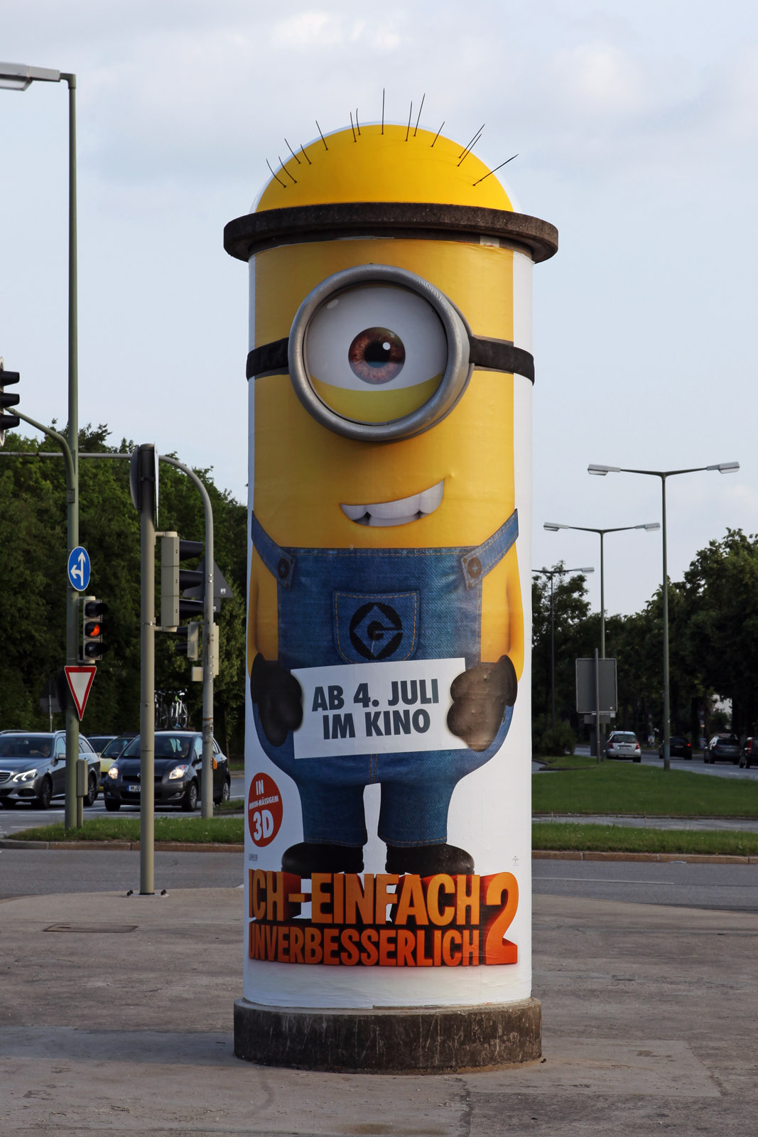 Den „Achtung, ich bremse auch für Minions“-Aufkleber auf einem der örtlichen MVV-Busse konnte ich leider nicht ablichten, dafür aber diese Litfaßsäule, die derzeit direkt an der Autobahnausfahrt in Laim steht. Ich musste herzlich lachen, als ich sie das erste Mal gesehen habe. Und konnte nicht umhin, einen abendlichen Spaziergang zu unternehmen, um sie zu knipsen. Wenn es nach mir ginge, dann dürfte die gerne einfach immer so aussehen.