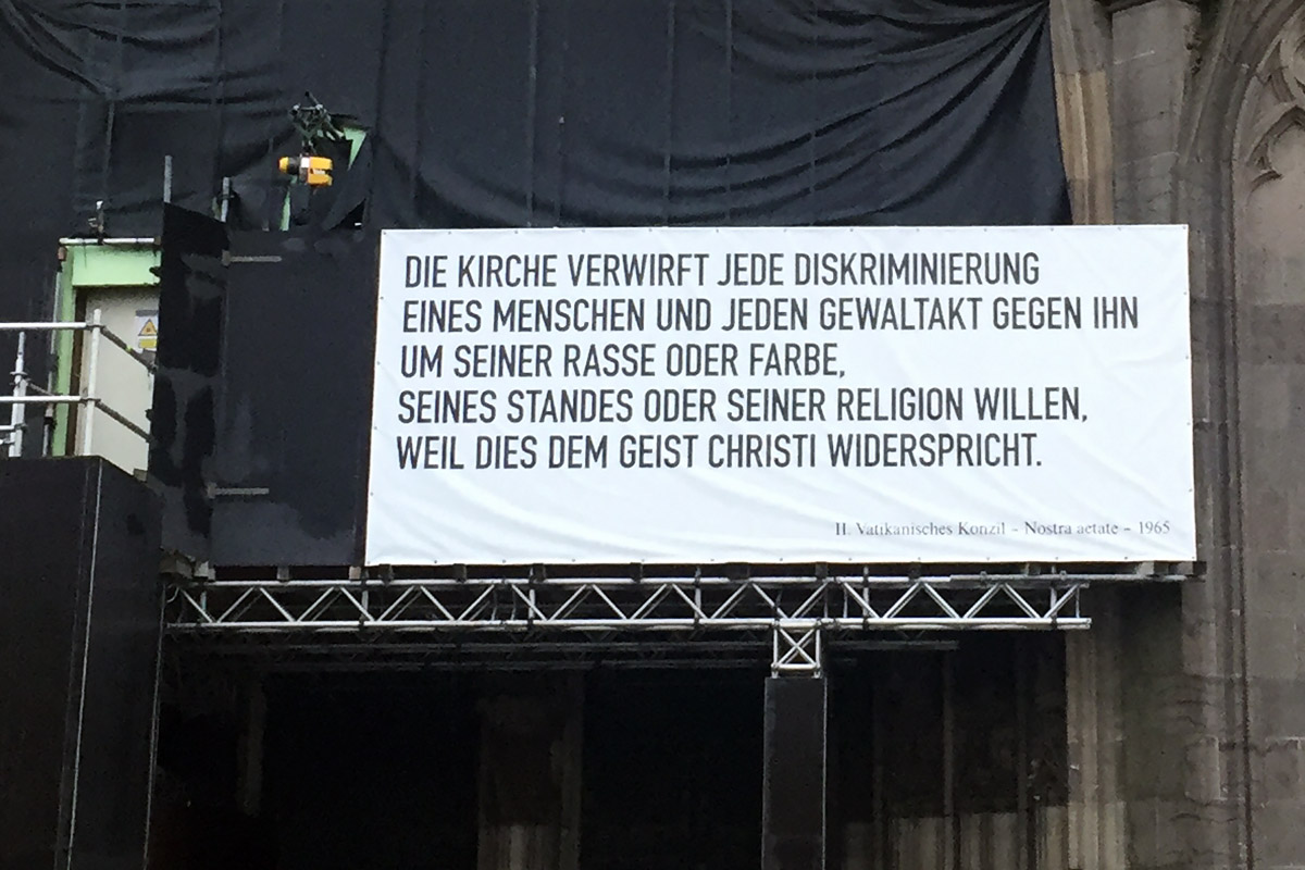 Liebe katholische Kirche in Köln: Ich finde es toll, dass ihr euch gegen Rassismus stark macht. Aber wäre es nicht vielleicht eine ganz gute Idee, da mal im eigenen Haus anzufangen? Ansonsten könnte der gerne mal gezückte moralische Zeigefinger ein wenig lächerlich daherkommen.