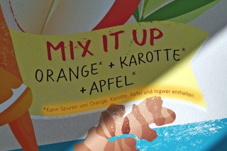 Nun ist mir unklar, welchen Allergen- und Kennzeichnungspflichten man heutzutage zu genügen hat, aber dass ein Getränk, welches aus Apfel-, Orangen- und Karottensaft zusammengemixt wird, just jene Zutaten enthält, mag ich doch schlicht und ergreifend mal voraussetzen. Und zwar hoffentlich in größeren Anteilen als nur eventuell vielleicht vorhandenen „Spuren von“.