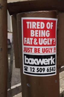 Bei einem meiner Spaziergänge durch’s Viertel entdeckte ich zufällig diesen Werbe-Aufkleber. Musste sehr lachen und habe mir danach ein Weilchen überlegt, ob das nun absolut grandioses oder doch eher kontraproduktives Marketing ist. Muss man sich auch erstmal trauen, so einen Spruch auf Aufkleber zu drucken und in der halben Stadt zu verteilen.