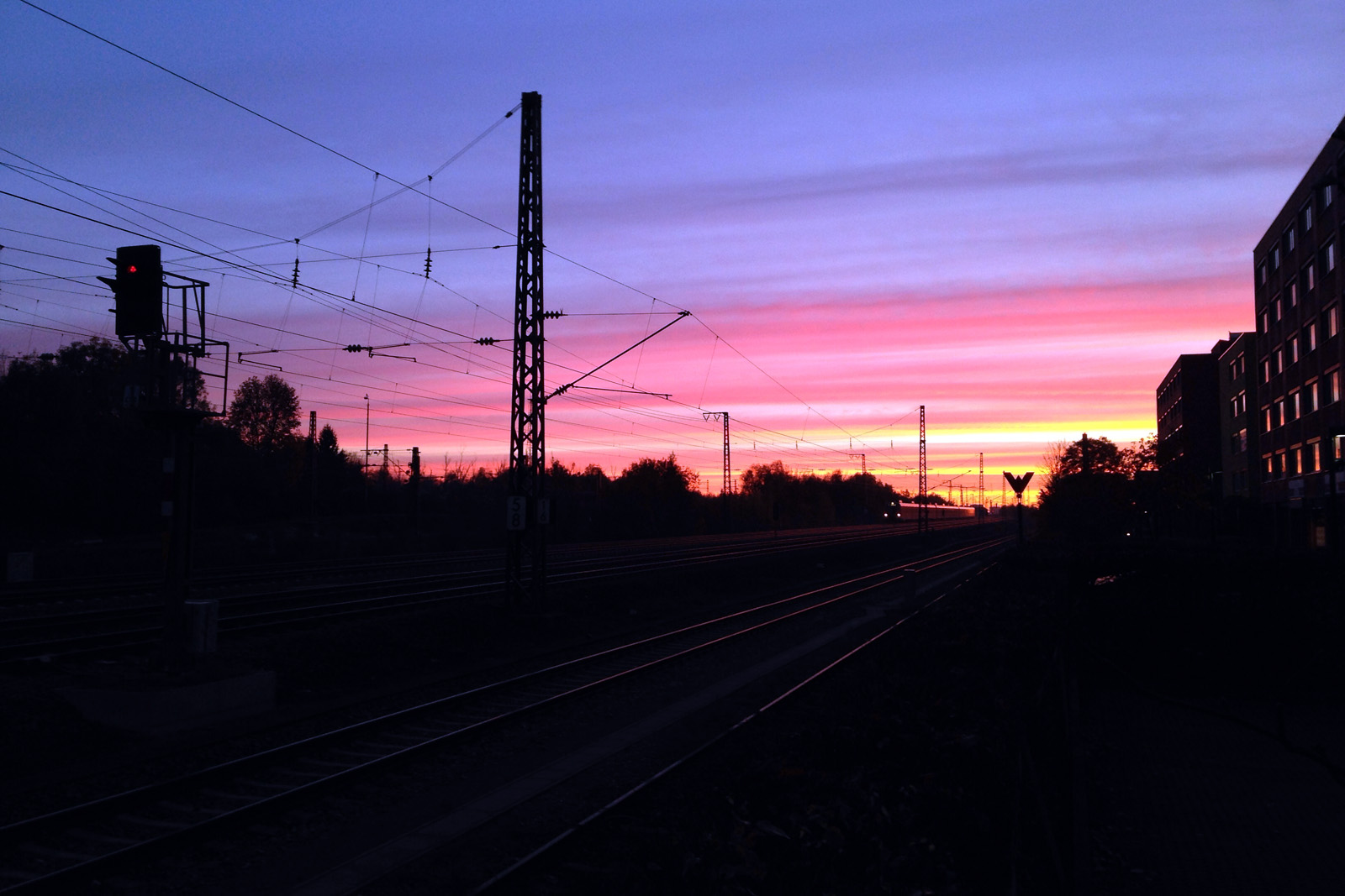 Aus unerfindlichen Gründen hab ich in der Nacht von Donnerstag auf Freitag ziemlich mies geschlafen und war beinahe schon froh, als es (aus meiner Sicht ‚endlich‘) irgendwann so früh war, dass ich aus dem Bett klettern und Richtung Büro aufbrechen konnte. Wesentlich früher als sonst. Eigentlich war das gar nicht so schlecht, andernfalls hätte ich diesen wunderschönen herbstlichen Sonnenaufgang verpasst.