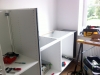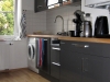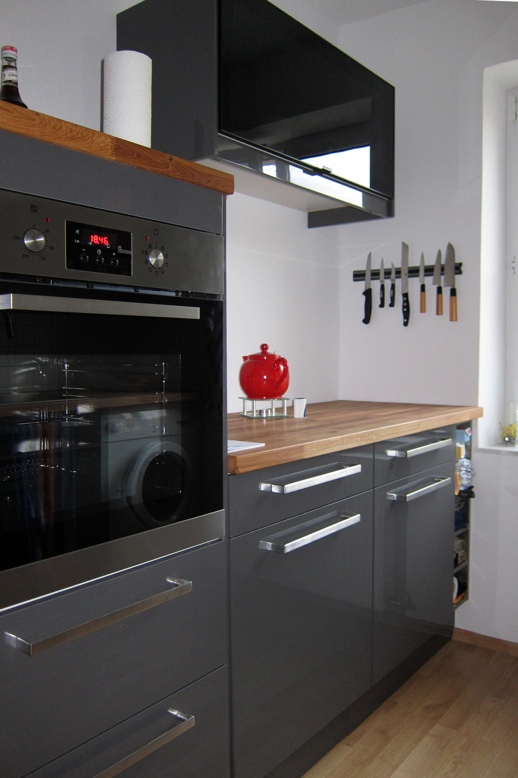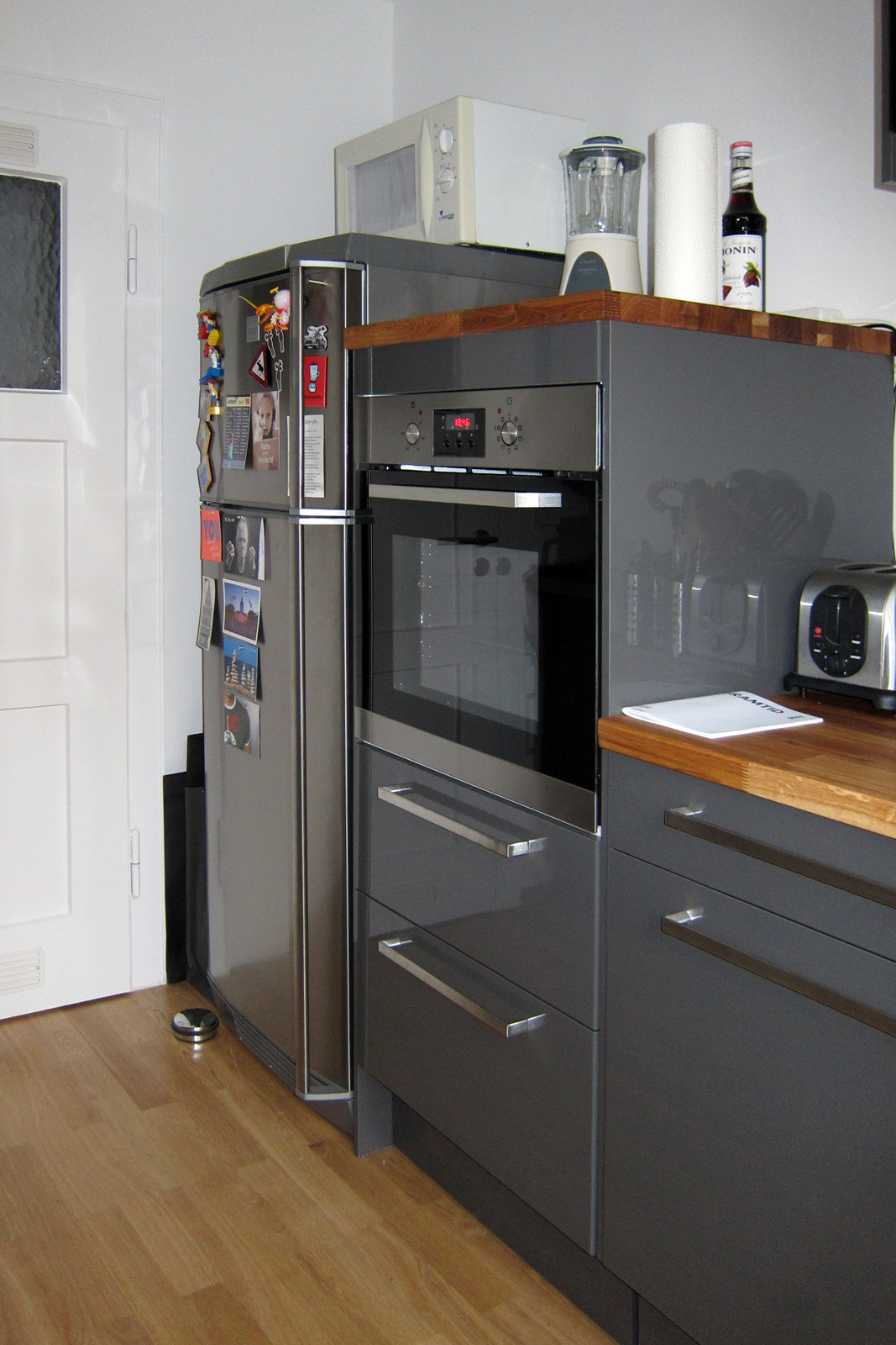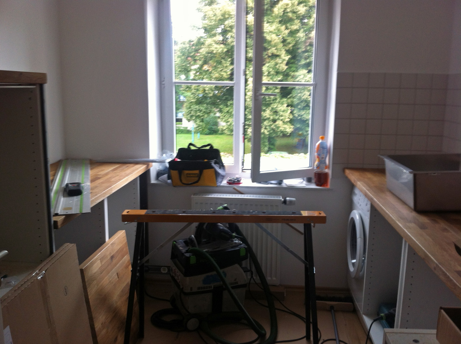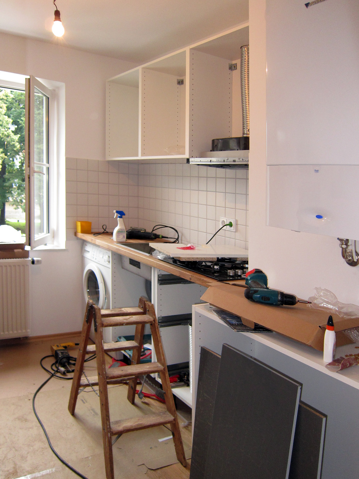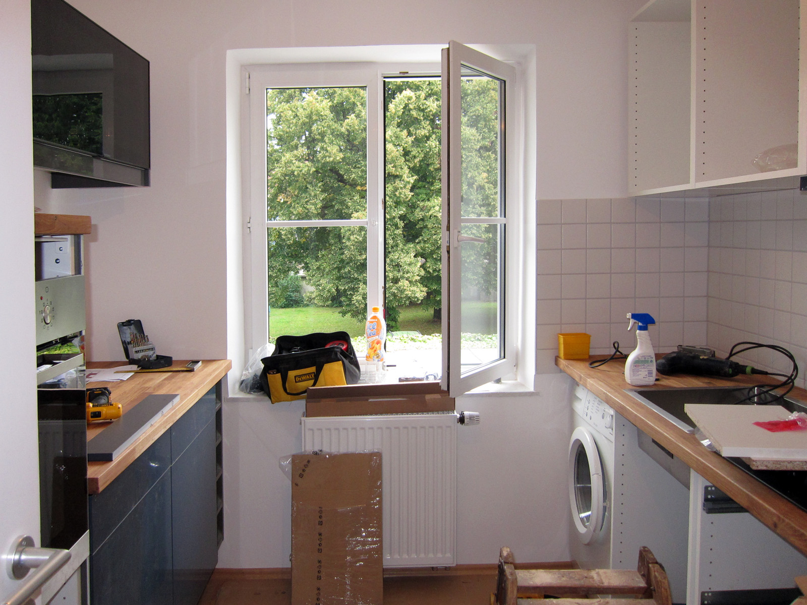 Und sie waren gut. Meine Küche ist vom Raum her recht doof – die Wände sind nicht gerade, 90 Grad Winkel gibt es nicht und sie ist eng. Dennoch haben sie es geschafft, dass alles passt. Die Arbeitsplatten sind perfekt gesägt und angepasst, alle Schränke hängen bombenfest und in den passenden Abständen. Ich hätte das nie im Leben auch nur ansatzweise so akkurat hinbekommen, wie die beiden. Und schon gleich gar nicht in der selben Zeit. Selbst die beiden Profis waren bis nachts um eins beschäftigt. So lange hat es gedauert, bis alles fertig war. Und natürlich gab es zwischenzeitlich ein Problem – es war nämlich doch eine falsche Schublade im Lieferumfang. Für die haben sie aber spontan für Ersatz gesorgt – ein Anruf und zwei Stunden später stand ein Kurier vor der Tür, der eine andere Schublade gebracht hat. Kostenlos. Dumm nur, dass es wieder eine falsche war, weshalb unter meinem Herd noch ein Loch klafft. Aber der Ersatz dafür wird auch geliefert. Ich glaube, die beiden Jungs waren darüber mehr sauer als ich selber – sie hatten einen überraschend ausgeprägten Hang zum Perfektionismus, der darin Endete, dass einer der beiden von halb eins bis eins damit beschäftigt war, noch alle Türen so einzustellen, dass sie perfekt ausgerichtet sind.Und nun habe ich sie also – meine erste wirklich eigene Küche. Mit (fast) allem was mein Herz begehrt (leider habe ich keine Spülmaschine, die war beim gegebenen Raum schlicht nicht unterzubringen) – vor allem nach all den Jahren in der Liliencronstraße endlich wieder einen Gasherd. Und einen Ofen, der dem aktuellen Stand der Technik entspricht. Es macht richtig Spaß, irgendwas zu kochen. Und ich finde, dass sie richtig gut aussieht – auch wenn die weiße Waschmaschine das Gesamtbild ein Bisschen trübt. Aber man kann eben nicht alles haben…