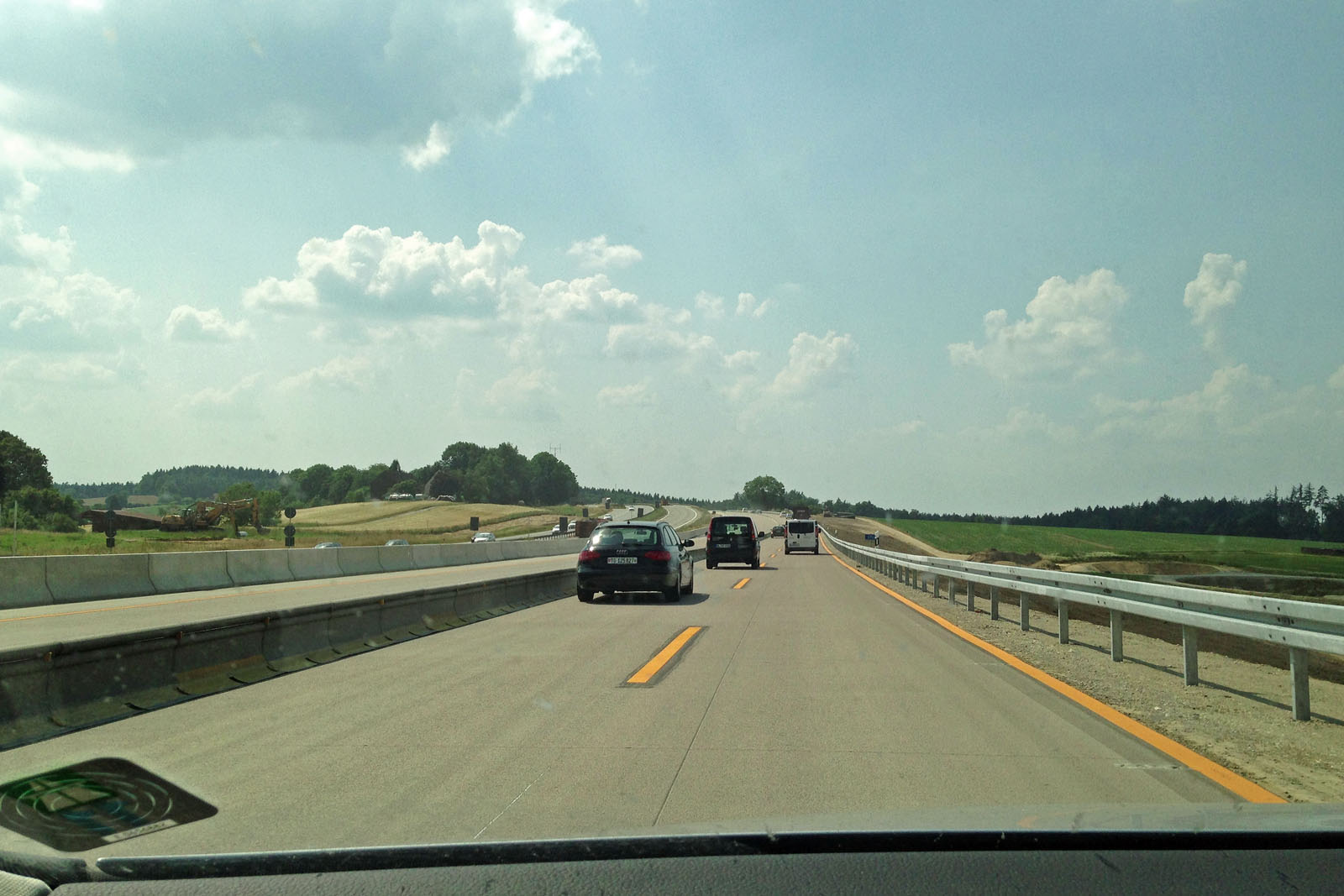 Spannendes Begleitprogramm bilden immer die rund 40km Baustelle zwischen Günzburg und Augsburg, wo die A8 unter erheblichem materiellen Einsatz und Aufbietung beeindruckender Baumaschinen auf sechs Spuren ausgebaut wird (was so ziemlich der Traum jedes kleinen Jungen sein dürfte. „Boah, Hammer-Baustelle!“). Anders als beim bestenfalls als „Vollkatastrophe“ zu bezeichnenden Ausbau der A8 zwischen Karlsruhe und Stuttgart seinerzeit, den man verkehrstechnisch ja leider als Volldebakel ansehen muss (auch wenn das Schlimmste seit einer ganzen Weile überstanden scheint), hat man sich hier für eine relativ harmlose aber auch radikalere Variante entschieden: man baut die komplette Fahrbahn kurzerhand neu – neben den bisherigen Fahrspuren.