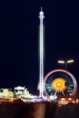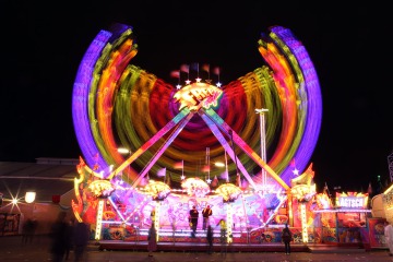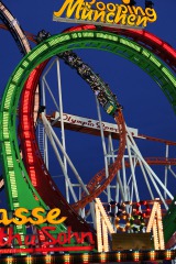 Meine Taktik um nicht völlig auszuticken: Möglichst viele Termine auswärts (gut, der Job trägt seinen Teil dazu bei), möglichst große Bögen um die Festwiese machen und Lokalitäten besuchen, die Wiesn-frei sind. Hervorzuheben ist hier das Café Kosmos in der Nähe des Hauptbahnhofes, dessen Wirt das Trachten-Verbot in seinem Laden höstpersönlich überwacht, indem er sich vor dem Eingang aufbaut und verkleideten Gesellen den Zugang verwehrt. Nicht immer zu deren Freude und auch nicht immer ganz konfliktfrei – aber die anwesenden Gäste wissen dies zu honorieren. Ich auch. Wäre es dort nicht immer so voll, ich würde vermutlich allabendlich dort anzutreffen sein, zumal die Getränkepreise für Münchner Verhältnisse geradezu traumhaft niedrig sind. Dennoch kam ich dieses Jahr nicht drumrum, die Wiesn zwei mal zu betreten. Einen Nachmittag musste ich mit Kollegen in einem Festzelt verbringen. „Musste“, da wir den Tisch reserviert hatten, um Kunden aus England im Klischeedenken über die Deutschen zu bestärken. Dummerweise durften die uns aber gar nicht besuchen kommen. Und da der Schwabe ja nichts verkommen lassen kann, sind wir einfach mit ein paar Kollegen hin und haben die Verzehrgutscheine durchgebracht. Da das aber an einem Mittag stattfand, hielt sich der Peinlichkeits-Faktor noch einigermaßen in Grenzen, zumindest ist man im Zelt nicht kollektiv ausgeflippt, keine hat seinen Mageninhalt über uns ergossen und die Lautstärke hatte sich auf einem Niveau eingependelt, das Unterhaltungen nicht völlig ausgeschlossen hat. Als Fazit dieses Nachmittages schwanke ich nun zwischen den Extremen „nie wieder“ und „mal abends hingehen und fastziniert-entsetzt Sozialstudien anstellen“. Je nach dem, wie stark meine masochistische Ader aktuell ausgeprägt ist. Mal abwarten, wie ich das kommendes Jahr sehe.Den Besuch Nummer zwei habe ich taktisch klug auf einen Sonntag Abend verlegt, an dem es für gewöhnlich nicht mehr so schrecklich voll ist. Er diente dazu, einige Bilder zu machen. Denn so sehr mich dieser Rummel um die Festzelte auch nervt, so gern mache ich aber Fotos von halsbrecherischen Höllenmaschinen. Und davon gibt es natürlich jede Menge. Dementsprechend fürchte ich ja, dass ich auch kommendes Jahr wieder mindestens einen Spaziergang über die Wiesn machen werde – aber ein Fan der ganzen Veranstaltung werde ich sicher nicht mehr…