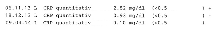 Gemäß der letzten Blutuntersuchung von Anfang April, lassen sich inzwischen so gut wie keine Entzündungen mehr nachweisen. Betrug der CRP-Wert anfangs noch rund das Sechsfache des „Normalwertes“ (0,5 wird als zulässiger Grenzwert angesehen), sank er inzwischen beinahe bis zur Nachweisgrenze ab. Damit hat Enbrel in sehr kurzer Zeit das geschafft, was das Ibuprofen in all den Jahren nicht hinbekommen hat – die Entzündungen an meinen Knochen in den Griff zu bekommen.