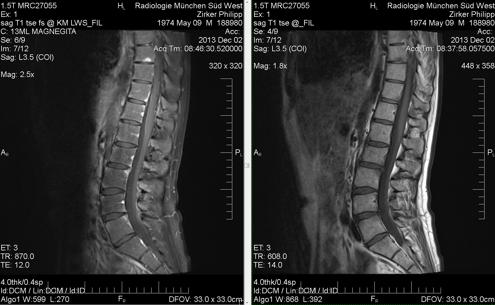 „Es zeigen sich Knochenmarko?deme bzw. eine versta?rkte Kontrastmittelaufnahme im Sinne einer entzu?ndlichen Aktivita?t an praktisch allen Vorder- und Hinterkanten der Wirbelko?rper im Untersuchungsbereich. Daru?berhinaus findet sich eine sog. Andersson-La?sion an der Bodenplatte von BWK 9. Eine versta?rkte Kontrastmittelaufnahme ist auch im Bereich der Kostovertebral- und Kostotransversalgelenke der Wirbelko?rper BWK 10-12 nachweisbar. Degenerative postentzu?ndliche Vera?nderungen sind vor allem in den Facettengelenken LWK 3-5 nachweisbar. Die mitabgebildeten Ileosakralgelenke sind in den kaudalen Anteilen beidseits kno?chern vo?llig durchbaut als Hinweis auf abgelaufene entzu?ndliche Vera?nderungen.“
