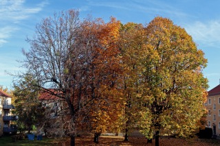 Anfang der Woche war der linke Baum nämlich schon fast komplett kahl, der rechte noch fast vollständig grün und die beiden mitteren in einem Zustand irgendwo dazwischen. Sah toll aus. Nicht, dass der Anblick gestern viel schlechter gewesen wäre, aber am Montag sah das eben noch schöner aus. Der Herbst hat schon was.