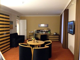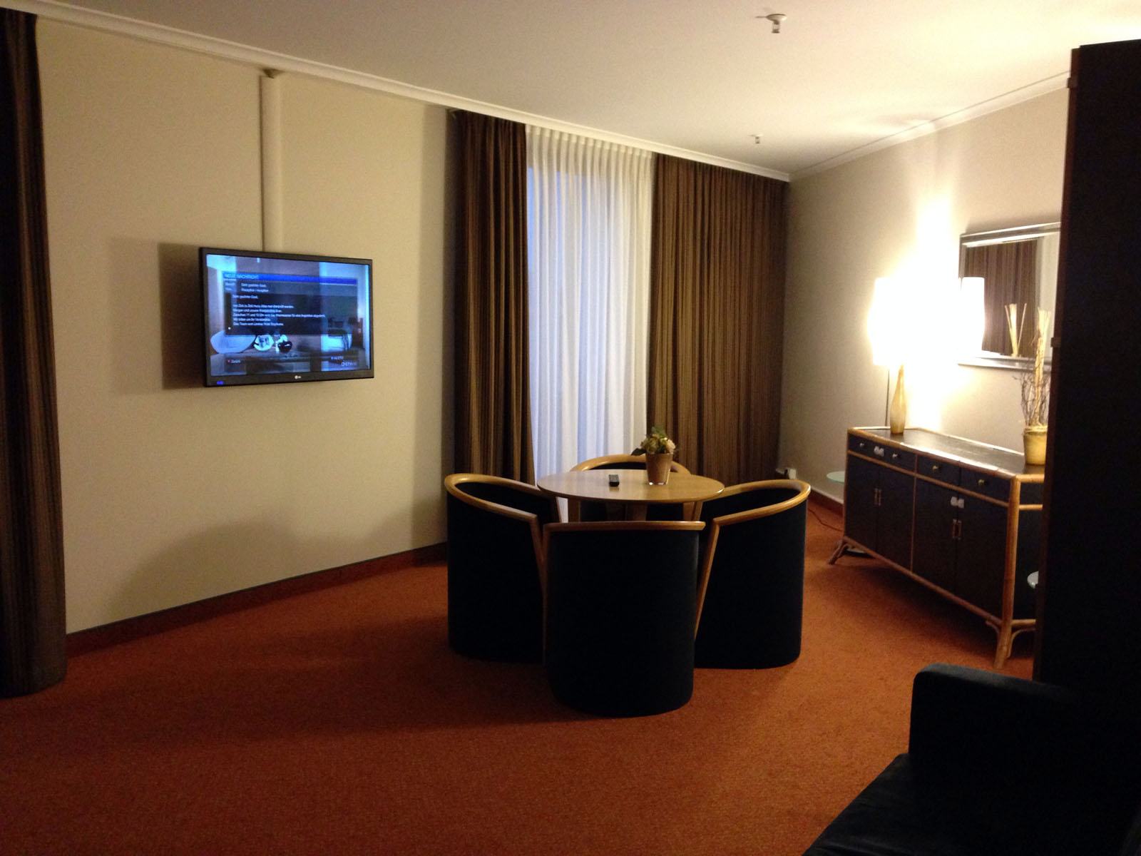 Diesmal war das anders. Das lag zum Einen daran, dass sich das Hotel im Leverkusener Fußballstadion befindet (samt Konferenzräumen mit Blick auf das Spielfeld), zum Anderen daran, dass man mir aus unerfindlichen Gründen ein Zimmerupgrade zukommen ließ. Ich habe keine Ahnung, wie das eigentliche Zimmer gewesen wäre – das, was ich schlussendlich bekam, war eigentlich kein Zimmer, nein, es war ein Palast. „Suite“ nennt sich sowas wohl. Dieselbe bestand aus vier Räumen plus Eingangsbereich – Schlafzimmer, Wohnzimmer (mit kleiner Küche) und zwei Badezimmer. Jawoll, zwei Bäder. Eines mit Dusche, das andere mit Badewanne. Mir ist nicht ganz klar, wozu man so etwas braucht, aber es hat definitiv was. Zumindest war ich kurz baff.