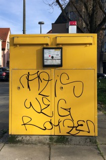 Nebenstehendes habe ich vergangene Woche in Degerloch am Busbahnhof fotografiert. Trifft meine volle Zustimmung. Na gut, ich hätte es verbal vermutlich dezent anders formuliert, aber so kann man das natürlich auch ausdrücken. Und vermutlich verstehen es die potentiell Angesprochenen sogar besser, als wenn man das Eintreten gegen rechtes Gedankengut hinter einer verschwurbelt-intellektuellen Formulierung versteckt. Wobei ich mit dem Urheber des Werks gern mal eine Fachdiskussion über Zusammen- und Getrenntschreibung bzw. das Setzen von Trennstrichen führen würde…
