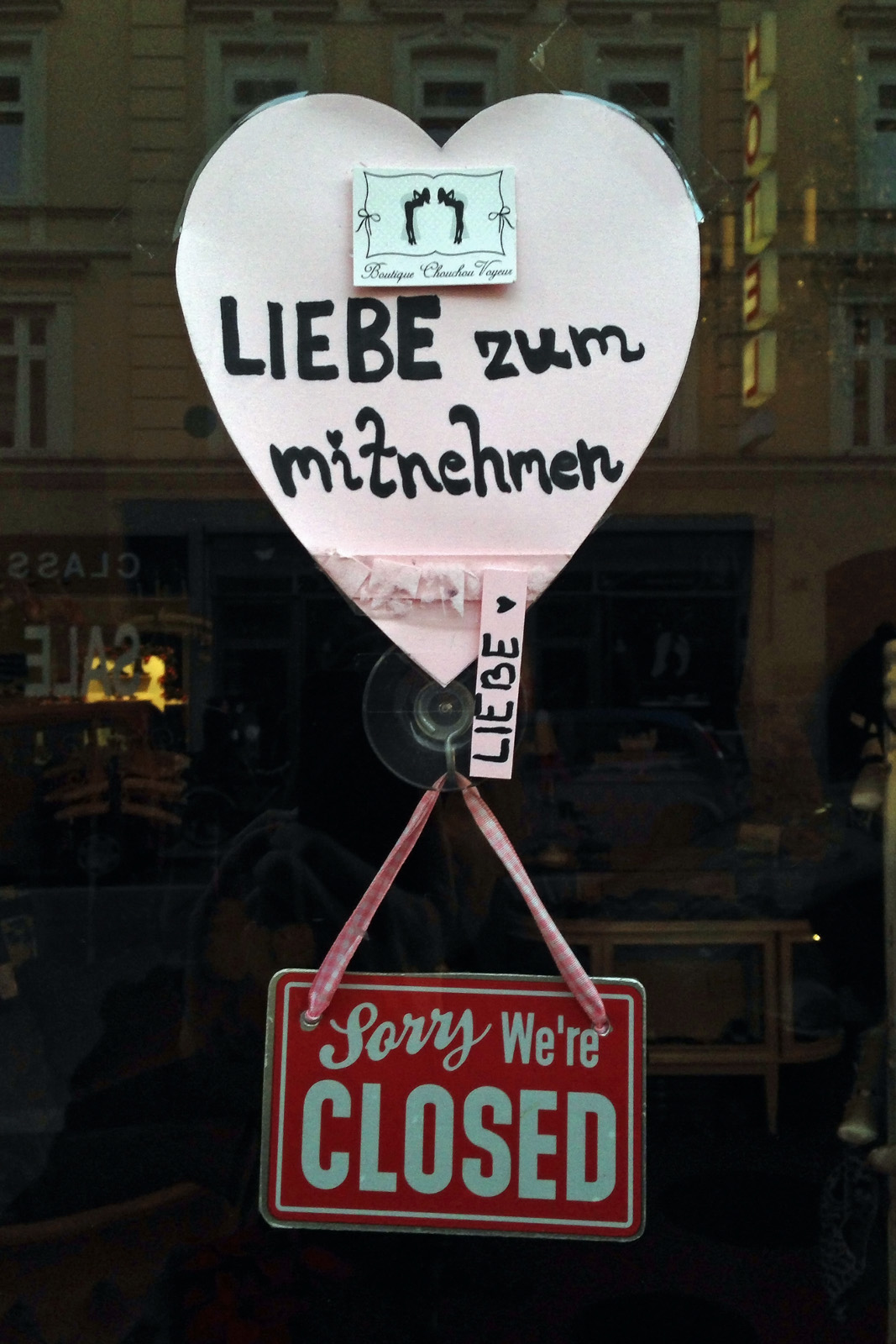 Also ging’s weiter Richtung Türkenstraße, vielleicht wäre im Tea-House ja noch ein Plätzchen frei (um es vorwegzunehmen: nein, natürlich nicht). Dafür sind wir auf dem Weg dorthin aber an meinem Highlight des Tages vorbeigekommen, einem Laden für, sagen wir mal, recht sündige Unterwäsche. Nein, dieser selbst war nicht das Highlight, wohl aber ein Schild das sie an die Eingangstür geklebt haben. „Liebe zum Mitnehmen“. Für umsonst. Daran angeklebt lauter kleine Abreiß-Zettelchen, mit „Liebe“ beschriftet. Was für eine herzallerliebste Idee! Und ein Bisschen Liebe (um genau zu sein: eine Einheit) war sogar noch übrig. Die trage ich jetzt im Geldbeutel mit mir herum.Eines meiner Lieblings-Blogs ist voll mit solchen Fundstücken – jetzt hätte ich dann wohl auch eines beizutragen. Ich weiß schon, warum ich ziemlich gern auf Seitenstraßen durch Schwabing und Maxvorstadt schlendere. Denn obgleich sie natürlich relativ fest in der Hand von hippen und ansatzweise wohlhabenden Einwohnern sind, ist die Laden- und Kneipenkultur dort eine sehr nette. Und man findet eben Kleinigkeiten wie diese hier. Oder Läden, die sich nicht entscheiden können, ob sie lieber Klamotten, Lampen oder doch Krempel verkaufen wollen und sich einfach alles anbieten. Einfach charmant. Auf alle Fälle um Längen netter als alle überlaufenen Weihnachtsmärkte der Welt. Und an sonnigen Sonntagen offensichtlich ein wesentlich besserer Aufenthaltsort als die Theresienwiese, die Kaufingerstraße oder all die anderen Orte, an denen man „was geboten“ bekommt.
