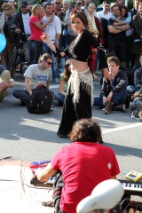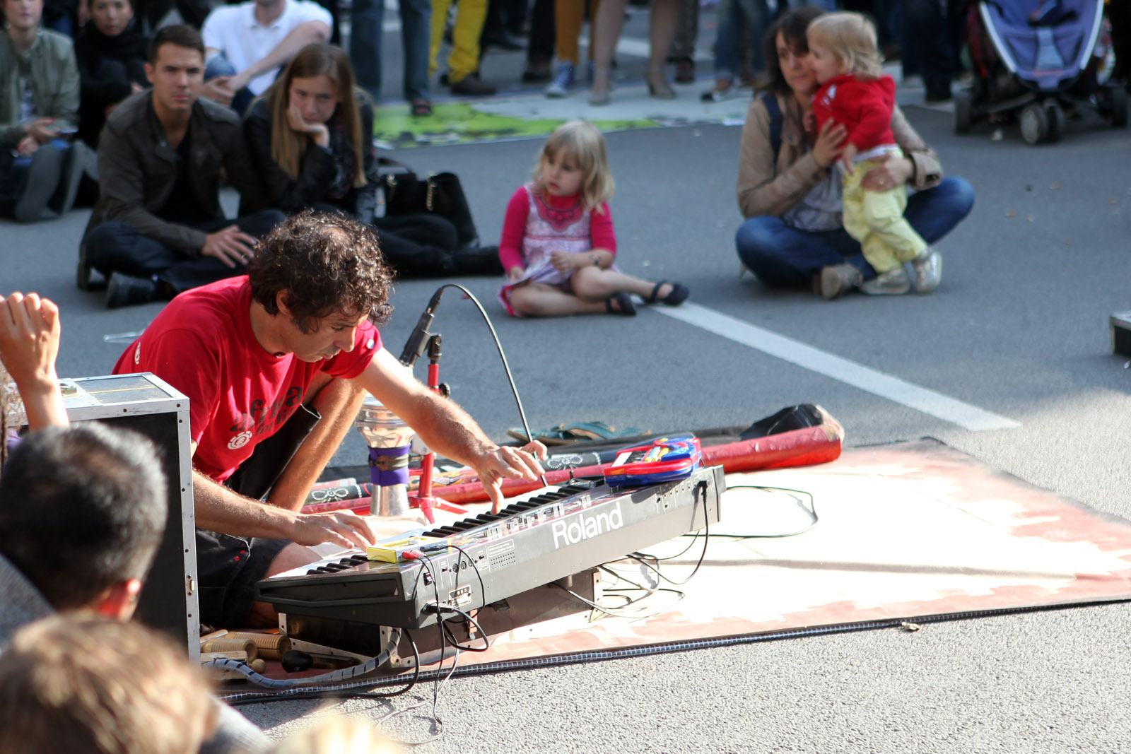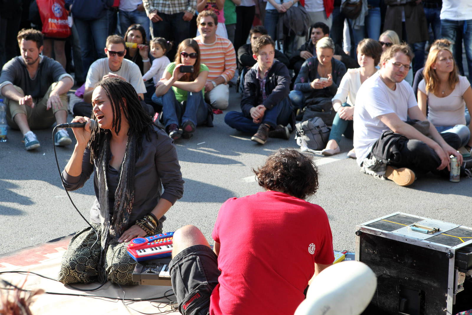 Und dazwischen: immer wieder Bühnen, auf denen diverse Auftritte geboten wurden. Gut, den Stand der freien Rede, an dem jeder, der schon immer mal vor größeren Menschenmengen sprechen wollte auf das Volk losgelassen wurde haben wir schnell übergangen, aber es gab auch genügend, vor denen man es länger aushalten konnte. Beispielsweise vor einem Trio aus Wien (zwei Gitarren und eine Geige), die eine derartig entspannte Musik zum Besten gaben, dass man sich am Liebsten einen Liegestuhl geschnappt hätte und nicht mehr weggegangen wäre. Außerdem waren die eingestreuten Ansagen einfach herrlich. Ebenfalls besonders hervorheben möchte ich einen Kerl, bei dem ich mir nach wie vor nicht sicher bin, ob er eigentlich zum regulären Programm gehörte, oder sich einfach eingeschmuggelt hat. Er kauerte am Boden über seinem Synthesizer, einem bisschen weiterer Elektronik und diverser sonstiger Dinge wie Percussion-Trommeln oder auch einer Spieluhr. Ihm zuzusehen war wie ein Lehrstück darüber, was Live-Sequenzing alles hervorzubringen vermag. Denn letztlich produzierte er mehr oder minder spontan irgendwelche improvisierten Elektro-Stücke. Und die waren richtig gut. Kein Wunder, dass ihn eine größere Menschenmenge umgab, alle sehr gechilled und in sich ruhend. Eigentlich habe ich nur auf den Geruch von abgebrannten bewusstseinserweiternden Drogen gewartet, das hätte ziemlich gut gepasst. Aber schlussendlich haben sich die Zuhörer vermutlich einfach an der Musik und sich selbst berauscht. Oder an der spontan dazukommenden Bauchtänzerin, die den Attraktivitätsgrad des Ganzen noch ein wenig steigerte.