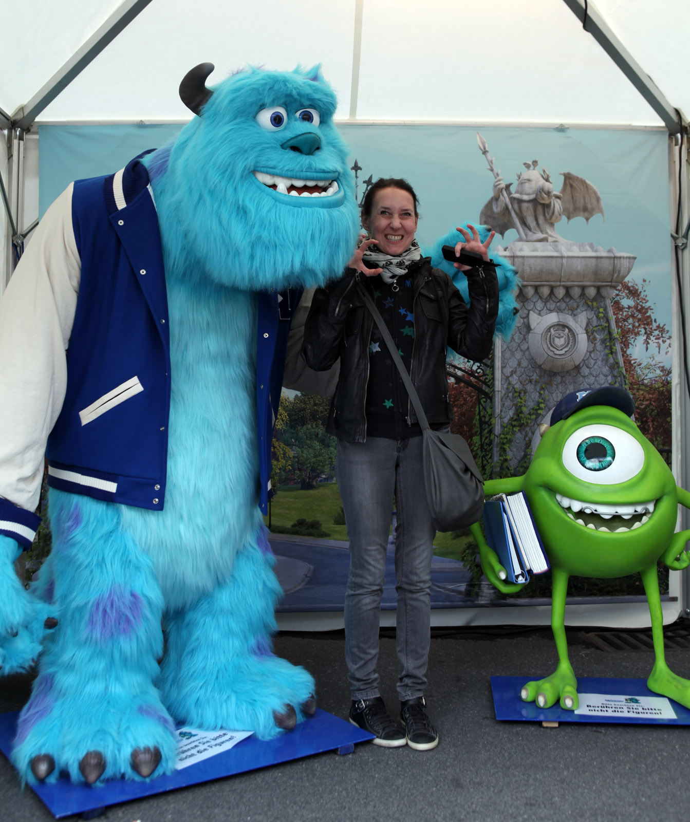 Der eigentliche Auslöser unseres Besuches war nicht das ziellose Schlendern, sondern die Tatsache, dass Disney einen großen Stand zum aktuellen Film „Monster Universität“ aufgestellt hat, bei dem man sich unter Anderem mit Mike und Sully photographieren lassen konnte. Eine Möglichkeit, die der wahre Fan natürlich unbedingt ergreifen musste, auch wenn wir eine halbe Stunde anstehen mussten, um die Bilder in Empfang nehmen zu können. Aber was tut man nicht alles, um einen eher mittelprächtigen Ausdruck eines Fotos mitnehmen zu können (was eigentlich eine ziemlich alberne Aktion war, denn letztlich hätten wir auch einfach die selbstgemachten Bilder abziehen können – die Qualität derer ist allemal besser als das, was am Stand produziert wurde).  Aber wie heißt es doch so schön: „Einem geschenkten Gaul schaut man nicht ins Maul“ und so ist meine Pixar-Devotialiensammlung jetzt um ein weiteres Stück reicher.