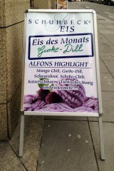 Da spaziere ich dieser Tage nichts ahnend durch die Stadt und erblicke wie aus dem Nichts den hier abgebildeten Werbeaufsteller. Ich stutze, lese zweimal, schüttle den Kopf und mache ein Foto. Kurz hatte ich erwogen, einfach in den Laden zu gehen, und mir zwei „Boppel“ Eis zu gönnen – „Eine Kugel Gurke-Dill und eine Schwarzbrot, bitte“.