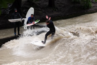 München hat etwas ähnliches zu bieten – den Eisbach. Er wird aus der Isar gespeist und verläuft auch weitgehend unterirdisch durch die Altstadt, tritt am südlichen Ende des Englischen Gartens wieder zutage, ehe er ein gutes Stück später wieder in die Isar geleitet wird. Allerdings ist der offenliegende Teil des Eisbachs wesentlich attraktiver als der Nesenbach. Zum Einen dient er (auch wenn das offiziell nicht erlaubt ist aber von der sonst so strengen Obrigkeit geduldet wird) im Englischen Garten als vielgenutzte Bademöglichkeit. Nackedeis inclusive. Zumindest im Sommer. Zum Anderen, und das ist weit spektakulärer, ist er weit über München hinaus als wunderbare Möglichkeit zum Wellenreiten bekannt. Grund dafür ist eine Steinstufe kurz nach dem Auslass aus dem Untergrund. Diese führt dazu, dass eine dauerhafte Stromschnelle entsteht, die als „stehende Welle“ bezeichnet wird. Hier tummeln sich bei guten Wetter haufenweise Wellenreiter, die immer schön einer nach dem anderen versuchen, sich möglichst lang auf dem Brett zu halten.