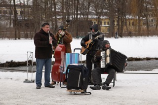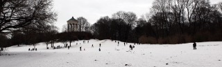 Und selbst die Straßenmusikanten weichen trotz arktischer Temperaturen nicht von der Stelle. Die im Bild dargestellten Herren der Schöpfung gaben beispielsweise hervorragende Musik zum Besten, obgleich ich mich ja frage, ob denen nicht innerhalb kürzester Zeit die Finger abfrieren müssten. Während ich deren jazzig-angehauchter Darbietung lauschte, wurde ich allerdings auch Zeuge eines Vorgangs, den ich (leider) inzwischen auch als typisch für München ansehe. Um die öffentliche Sicherheit zu wahren, patrouilliert die Münchner Polizei natürlich auch durch den Englischen Garten. Beritten übrigens. Sie kamen, sahen (oder hörten?) und schritten ein.